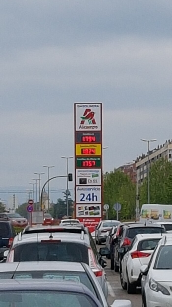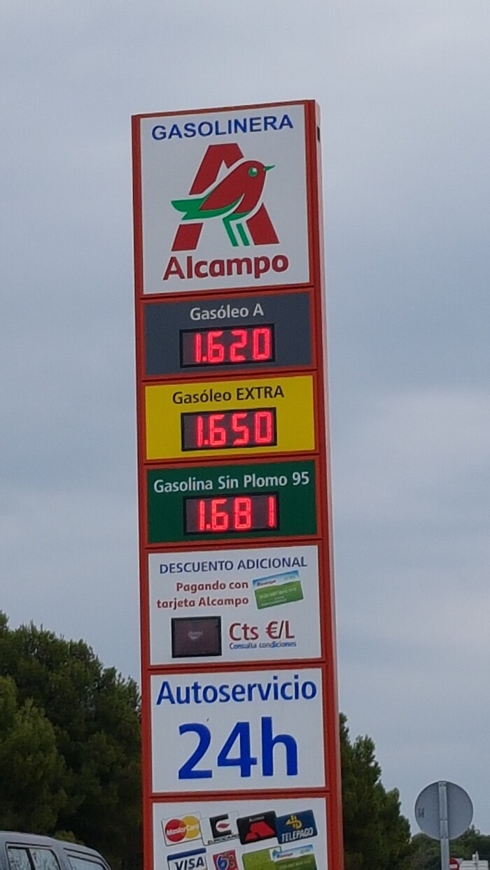 А вот цены на бензин и дизель продолжают понижаться. Вот вам сегодняшний скрин с общим графиком за последний месяц. Слева сравнительная таблица, где зеленым выделена колонка с ценами на сегодня (Sin Plomo это бензин, Gasoleo это дизельное топливо). Причем, это официальные цены заправочных станций, без учета дотаций от государства в 20центов/литр, которые вычитают из цены при расплате на заправке. Т.е. от 1,594€/литр надо вычесть 0,20€, чтобы получить реальную цену, которую водитель заплатит при заливе и заправляться сегодня выходит дешевле, чем в мае: