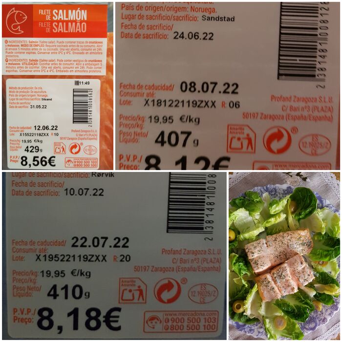Как и в предыдущих частях, в моих закупках регулярно присутствует Salmo salar (он же атлантический лосось, он же сёмга). Всегда покупаю его в одном и том же формате: серединка, разделанная, без чешуи, без кости, уже упакована в лоточек. В октябре он еще держал майскую цену, а в ноябре подорожал на один евро за кило (т.е. с начала года это суммарно целых 2 джва!!! евро дороже за кг):