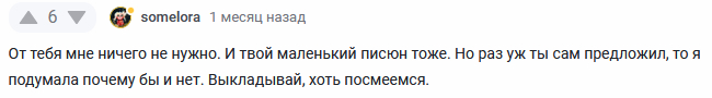 Итак, мы видим, что высказывание персоны очень сильно самой себе нравится, а больше не нравится никому. У неё пролайкан каждый свой камент, любой психиатр был бы в восторге от такого нарциссизма!