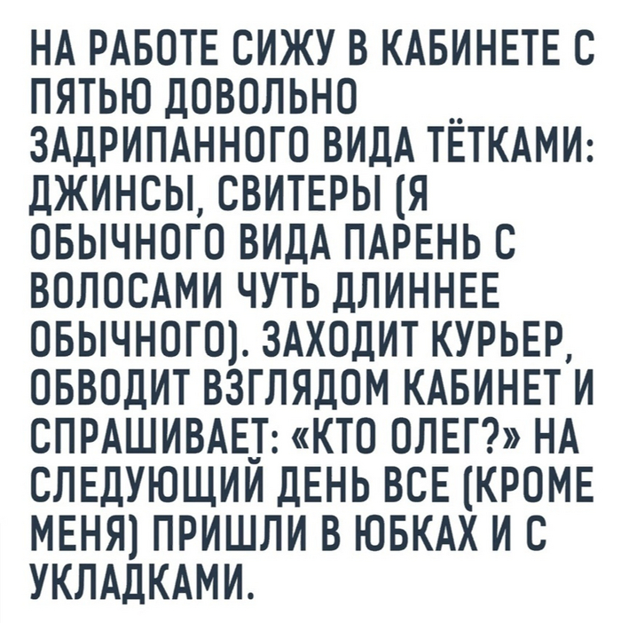 Никто из них не кричал о своём ущемлении и не заявлял о проявлении сексизма. Не просил отдать свою должность более достойному, невзирая на половые признаки.