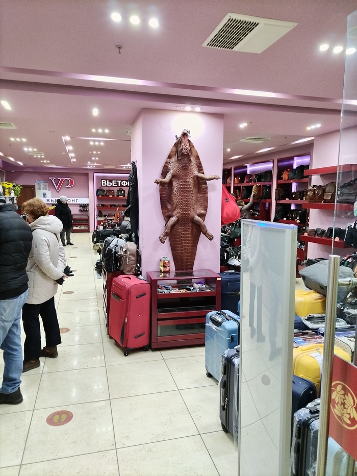 Перед уходом из ТЦ обычно беру орехи, зелёный и красный чай из Вьетнама и Китая и снеки к нему. Однако, желающие могут выбрать даже чемодан из крокодиловой кожи, судя по стендам некоторых магазинов: