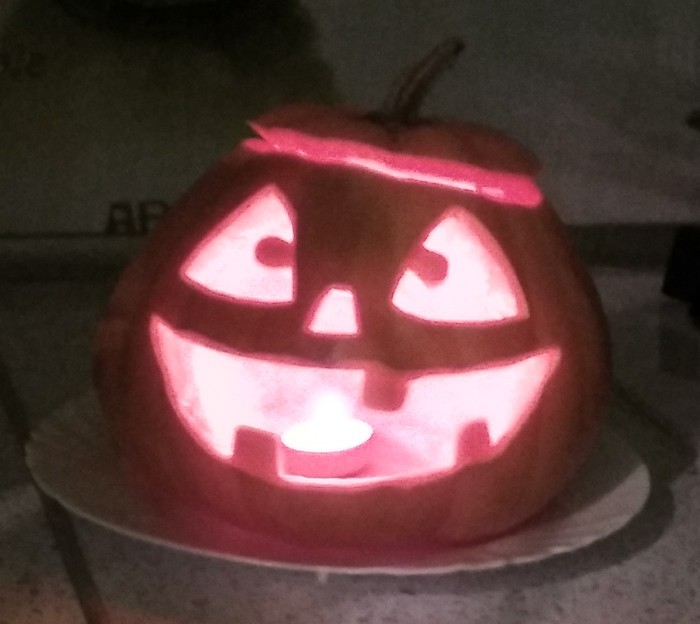 для начала был подсмотрен дизайн через гугл картинки), и куплена тыква подходящего размера. Ручкой окуратно нанесен эскиз на тыкву. В процессе резки нужно быть весьма аккуратным, а то я овлекся и воткнул нож в палец). Крышку поставил с зазором в сантиметр на 3 х зубочистках .