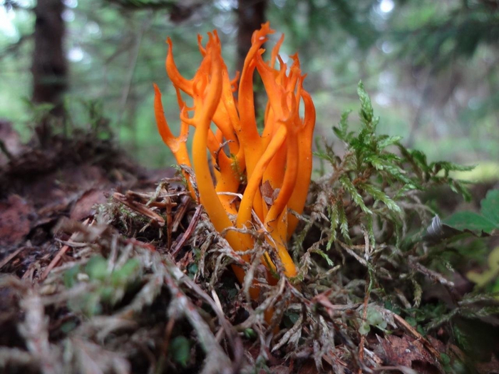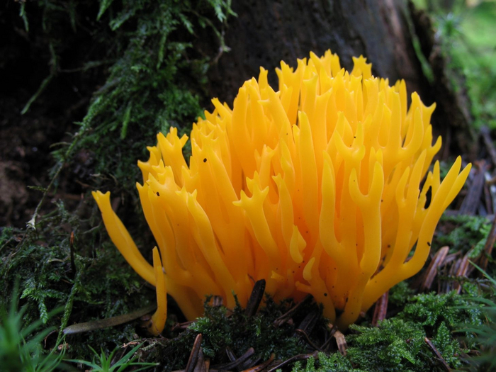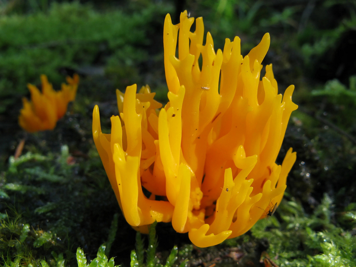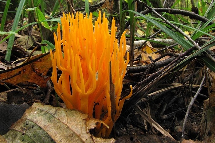 Когда идёшь по лесу, и под ногами, среди мха, гнилых веточек и прошлогодних листьев видишь этого гриб, кажется, что он заблудился, и ему самое место не в лесу, а в тропических морях. Яркие оранжево-жёлтые ветвящиеся стебельки напоминают скорей коралл, или оленьи рожки, за что калоцера клейкая (лат. Calocera viscosa) и получила одно из народных названий. При этом она не жёсткая, а резиново-желеобразная, немного даже прозрачная и будто светящаяся изнутри. И хотя при виде этого гриба такая мысль не возникает, но он все же съедобен, хотя вкусовые качества его невелики — резина со вкусом водорослей. Зато благодаря необычному и яркому внешнему виду его можно использовать для украшения разных блюд: холодных закусок, холодца, заливного.
