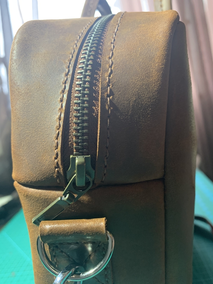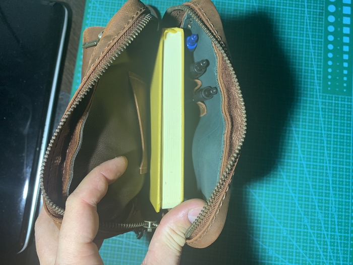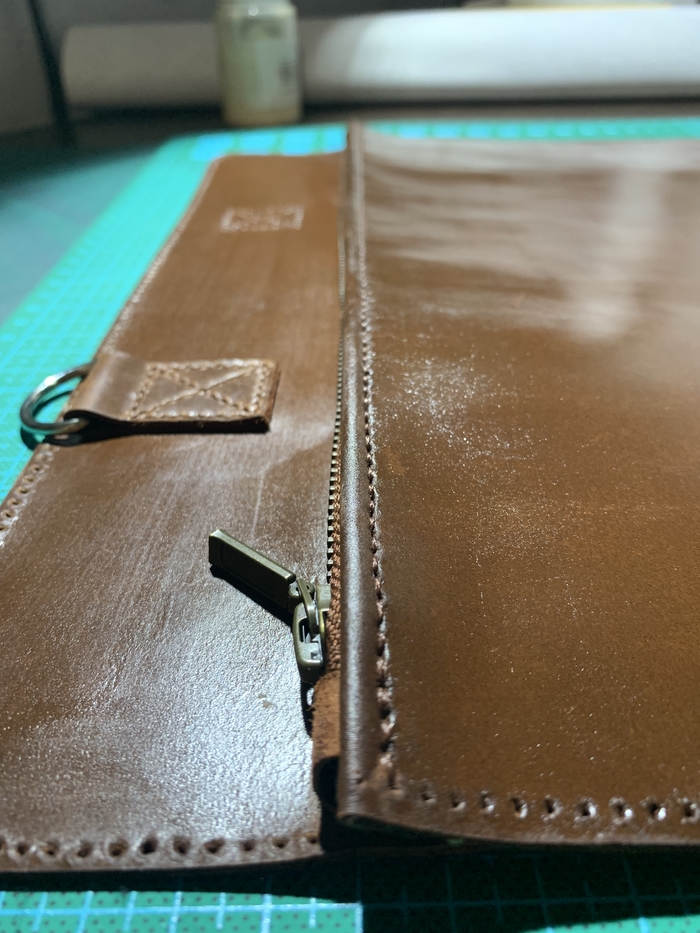 Кожа Крэйзи хорс, нить trencilo 0,5 внутренние швы, 0,65 наружние, размер подбирал чтоб с запасом входил лист А4, все швы ручные, отверстия делал шилом, так как пробойники только косозубые и ромбы ( а они под выворотный шов не годятся). Молния всем известной фирмы YKK.
