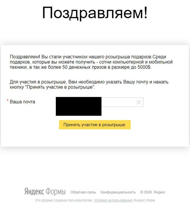 Попадаем реально на Яндекс Формы, Яндекс опять же ни сном, ни духом. Вводим адрес электронной почты (им он один фиг уже известен, раз на него пришло письмо) и попадаем уже на мусорный сайт.
