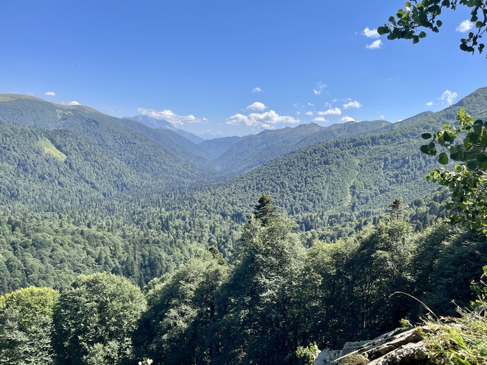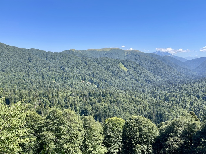 После начали подъём на Белореченский перевал. Подъём был через лес, но периодически встречалась открытая местность со смотровыми.