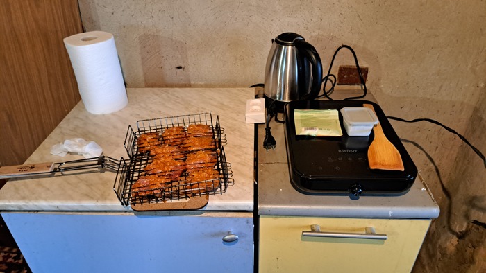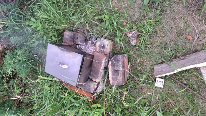 Решил попробовать закоптить чего-нибудь вкусного, заказал на озоне коптильню одну из самых дешевых (рублей 500 вроде), купили грудинку, куриную грудку и свиные ребра. На сутки замочил все это в солевом растворе 10%(на литр воды 100гр соли). Термощуп в мясо и на уголь, изредка подкидывал дровишек.