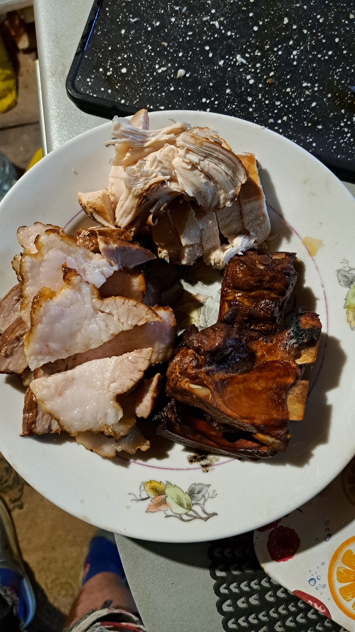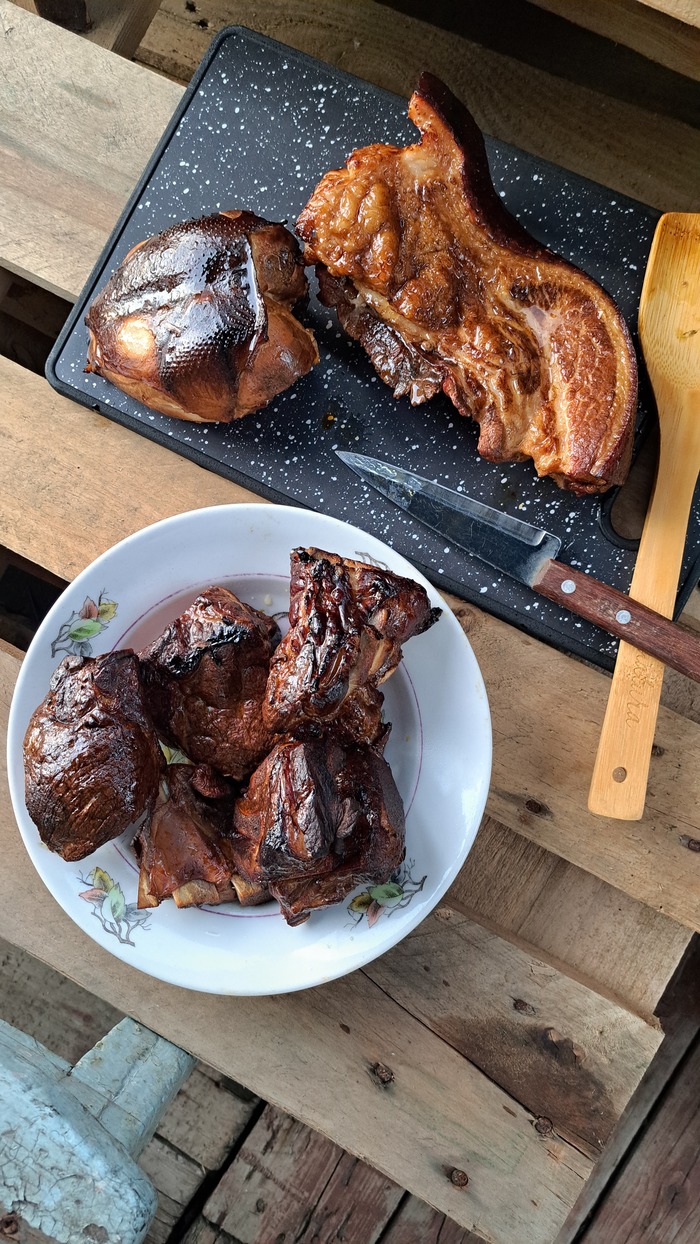 Режем пробуем и понимаем что ребра передержаны и есть их невозможно((( А вот грудинка хрюшки и грудка курочки это песня)) Первый раз пробовал коптить что-то и мне понравилось))