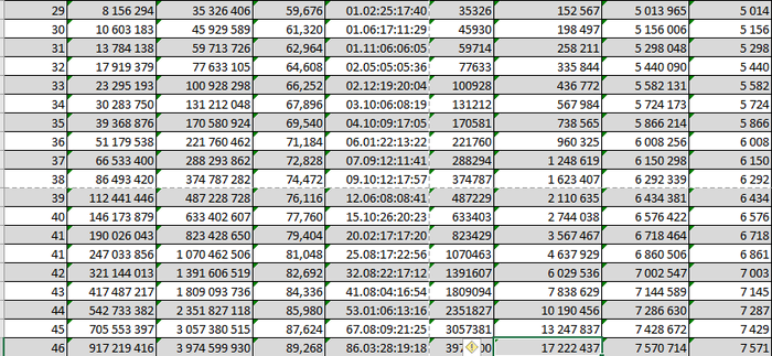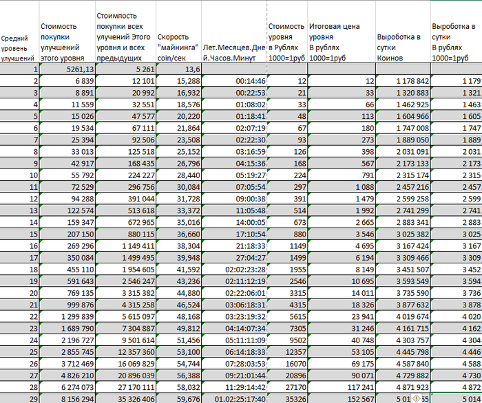 Стоимость улучшения увеличивается на 30% каждый уровень. Если выбирать улучшения самые выгодные ,а не как в таблице расчитано, а не ждать улучшения всего уровня, то результат будет чуть другой.