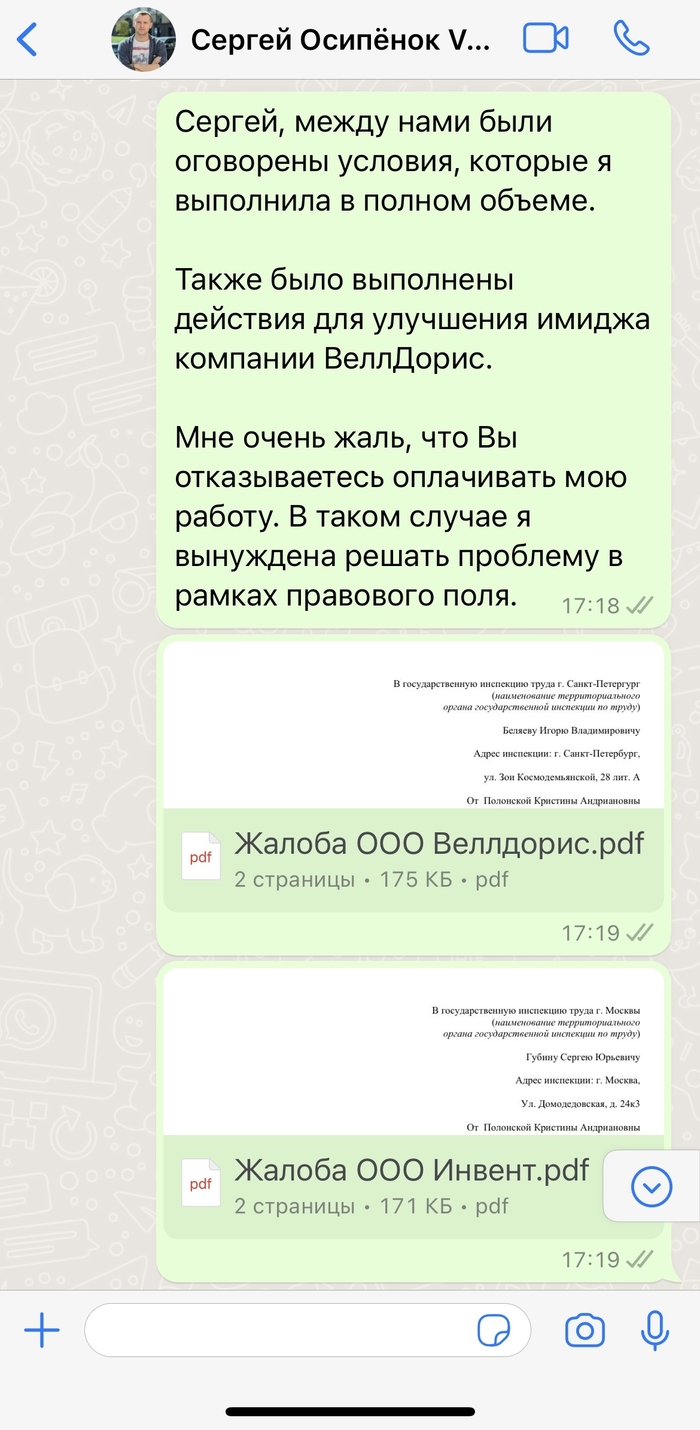 Я написала жалобы в трудовую инспекцию Москвы и Питера за отказ платить и за то, что не оформили меня официально. Отправила досудебную в головной офис в Питер.