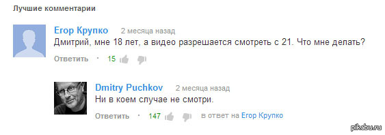 445 Kaifarik8 Гоблин об ограничениях 12 лет назад Как-то раз решил в шутку написать комментарий и вот что мне ответил Дмитрий Пучков. Очень порадовало )) [моё] Goblin Дмитрий Пучков