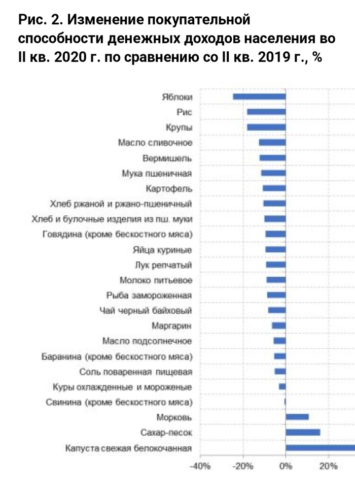 Если рассмотреть динамику покупательной способности денежных доходов населения в более длительной перспективе, например, за последние 10 лет (с 2011 по 2020 гг.), то во втором квартале 2020 г. по 12 из 24 основных продуктов питания был достигнут минимум покупательной способности: среди этих продуктов белый и ржаной хлеб, говядина, рыба, молоко, масло сливочное, чай черный…