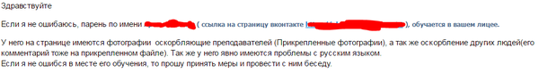 Мне честно стало обидно, и тут я понял что наверно смогу преподать ему жизненный урок. Я посмотрел через его друзей и группы из какого он города и из какой школы(так же на странице его были фотки с оскорбительными надписями в адрес учительницы, как потом выяснилось она еще и директором была), нашел название школы и почту, сделал архивную копию страницы этого парня через сайт майбэкмашин или как то так. И написал на почту его лицея всю информацию и скриншоты. Но первым делом сделал вот это, следущий скрин. Если что у меня тоже с русским не очень. В школе 3 была по нему.