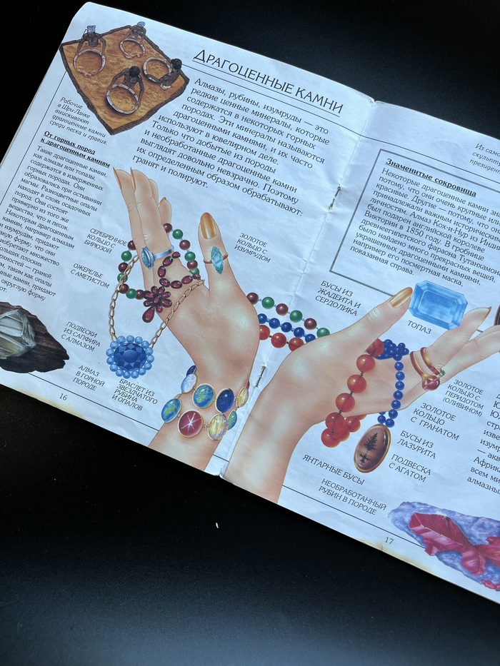 На следующей страничке на весь разворот были изображены минералы, как они есть. На меня это произвело большое впечатление. Бусы и кольца с камнями я видела, а тут, оказывается, вот так они выглядят в природе!