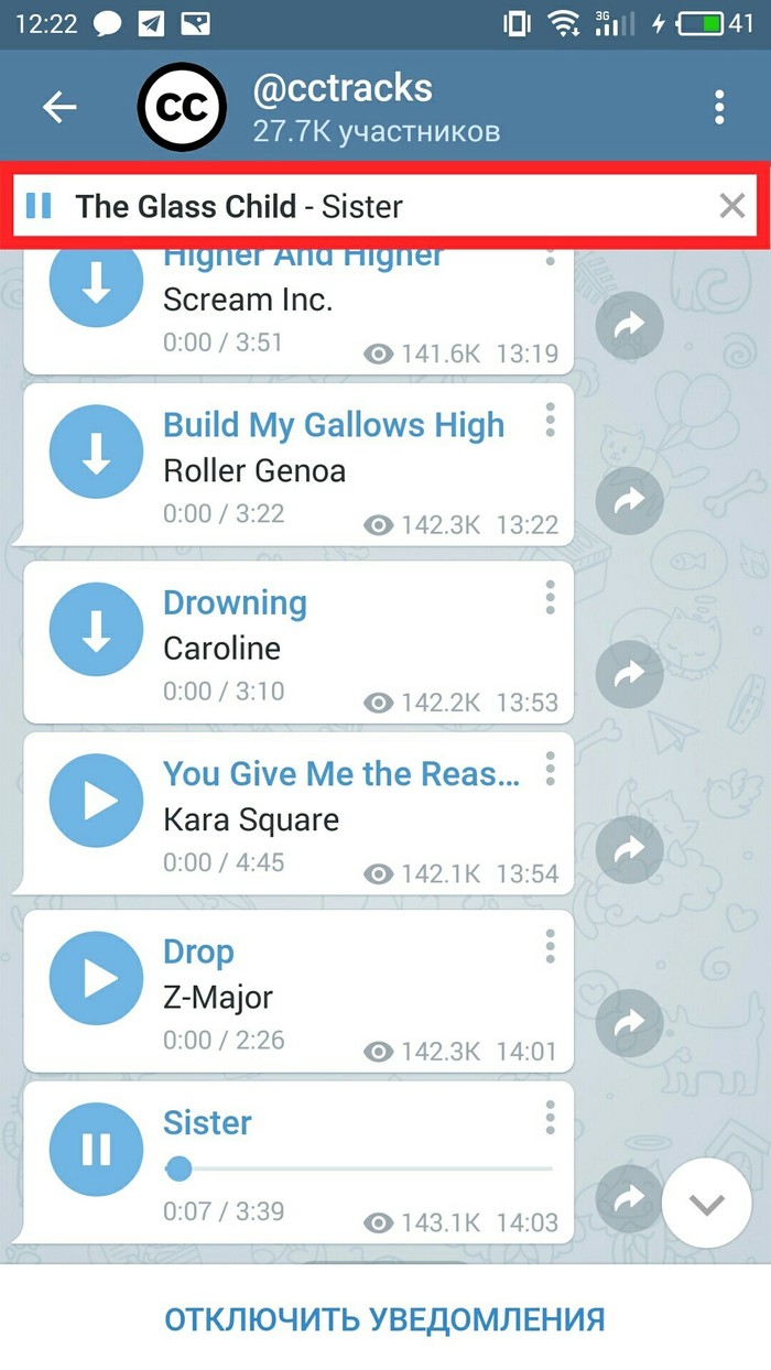 Зайдя туда (@cctracks), можно увидеть список треков в виде сообщений. Нажимаем на загрузку любого из них, ждем полной загрузки и включаем. Самое интересное начнется тогда, когда мы нажмем на узкую полосочку с названием трека в верхней части экрана.