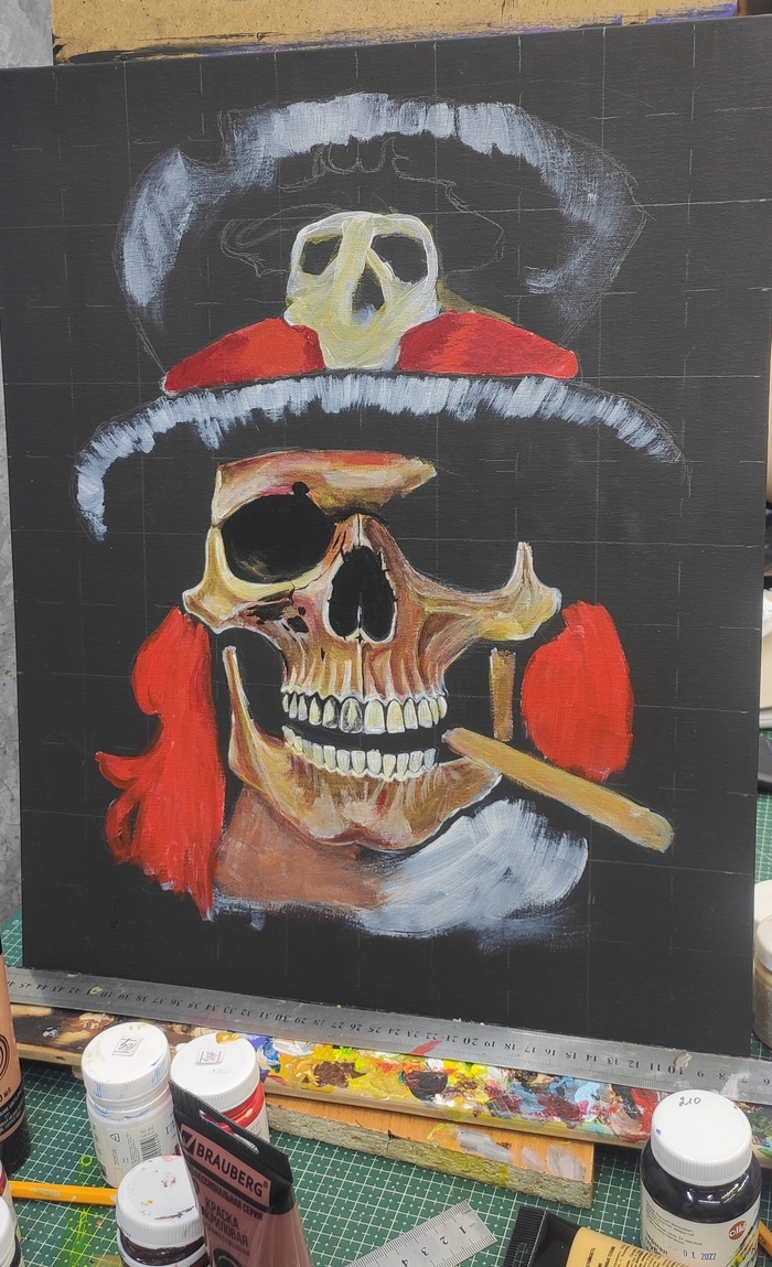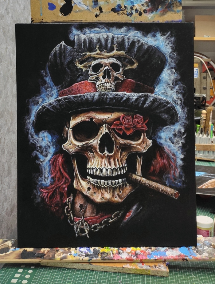 * Потом решил закрасить основной фон чёрной глянцевой краской, как и на самом черепе, мне показалось так будет интереснее смотреться.