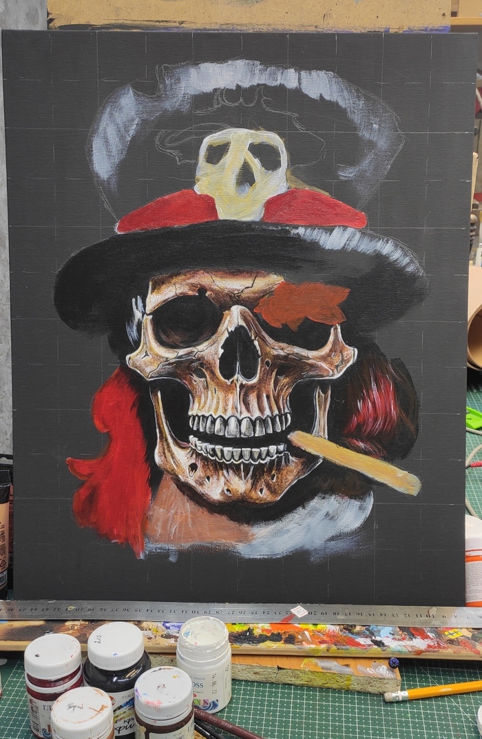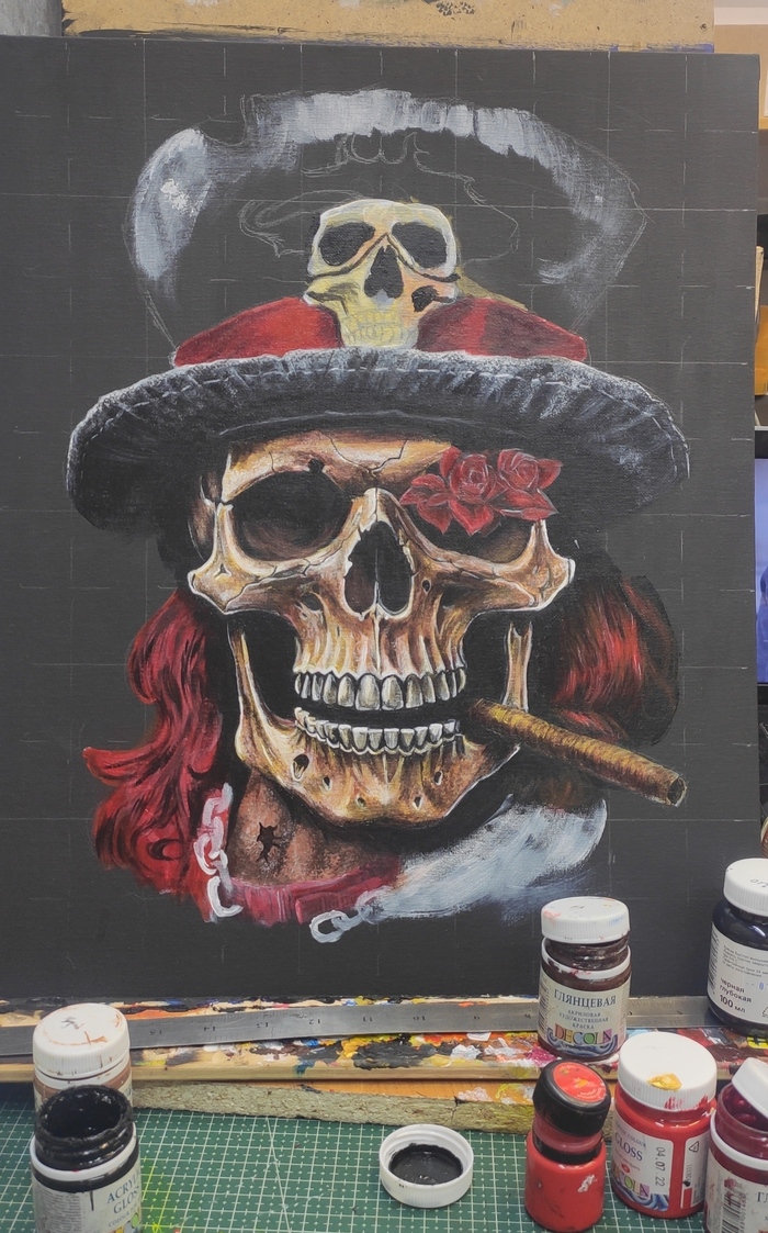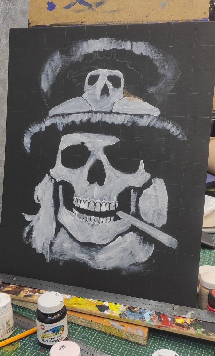 * Сначала закрасил холст черной матовой краской и сделал сетку карандашом. И на исходной картинке в фотошопе тоже сделал такую же сетку. Тут уже чувствую, что художники готовы меня убить за этого😁 Да, я понимаю, что это не профессионально и надо на глаз рисовать. Часто я так и делаю, но здесь хотелось облегчить себе задачу и сделать максимальное сходство.
