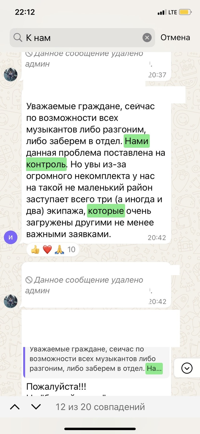 Районный отдел полиции создали чат жителей, для оперативной отработки заявок жителей - закладчики, наркоманы, драки, проститутки, нелегалы. Реально отправляют наряды по сообщениям в чате. Сами сотрудники пишут в чате. Короче, полиция здорового человека, что немного обескураживает. Но. В чате дофига неадекватных граждан. То просят убрать всех музыкантов с Невского и требуют экипаж на каждую точку где идут постоянные выступления.