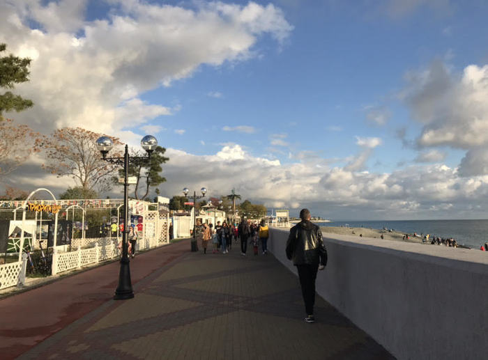 Длинная набережная полумесяцем под деревьями. Летом, наверно, классно гулять по ней. Город сам понравился, больше чем Анапа. Более современный, не знаю... Но, горочки и проблемки с водой.