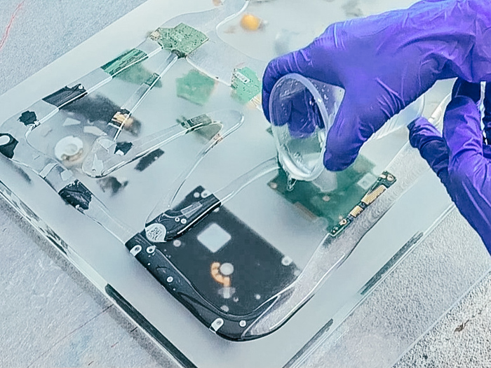 Ответ пришел неожиданно - заключить жесткий диск в эпоксидную смолу. Этот материал наглядно покажет невозможность восстановления жесткого диска и данных на нём. Внешний вид получившегося "артефакта" вызывает у наблюдателя ощущение, что перед ним что-то таинственное и загадочное.