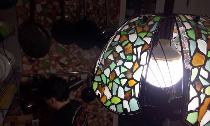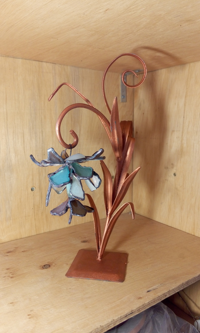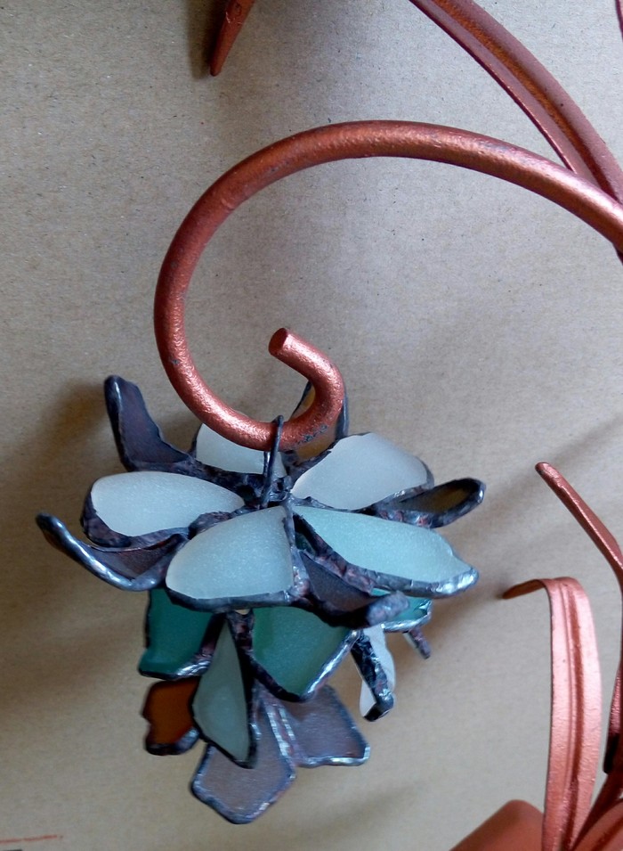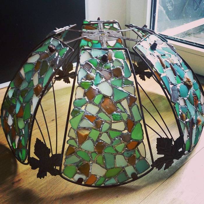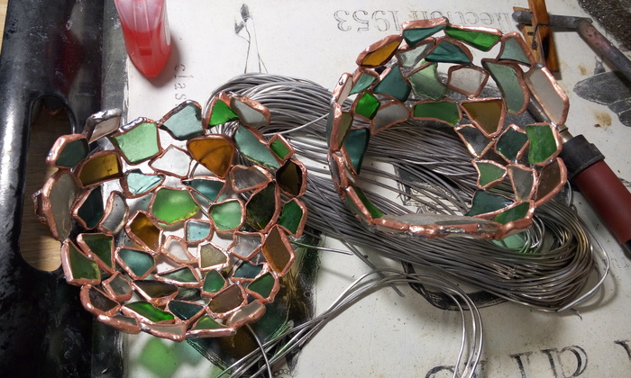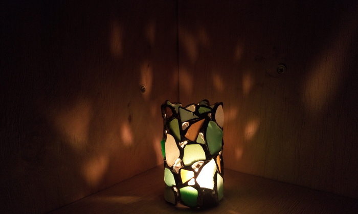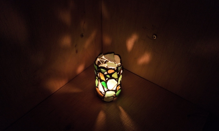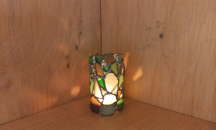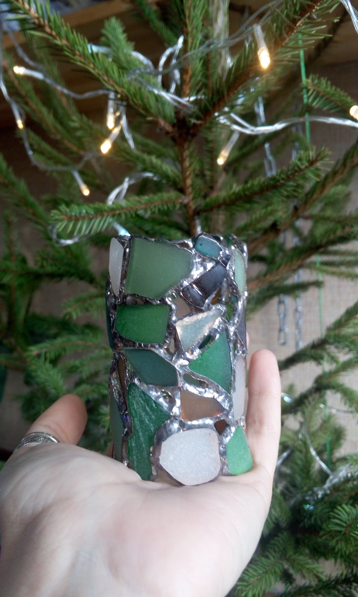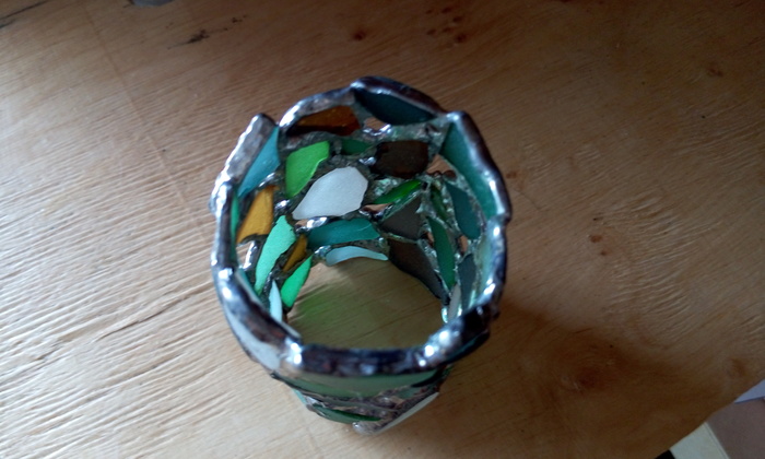 Вазочка из вперемешку морского стекла и осколков керамики оттуда же, с пляжа. Хотела сделать водонепроницаемую, вышло только на первые см 5 - разная толщина кусочков мешает, плюс я сперва выгнала ее, а потом стала пропаивать швы - уже неудобно внутрь доставать. В итоге подумала - а вдруг где фольга отслоится, все равно стремно, проще поставить внутрь пластиковую колбу.