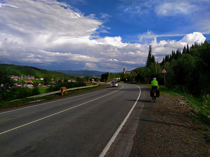 Перекусили в поселке, погрелись на солнышке с отличным видом на домики. Так бы и пол дня могли провести, наблюдая за неспешной работой местных жителей с высокого обрыва. Но у нас впереди был еще не один десяток километров и подползающая темнота облаков не внушала оптимизма. Из поселка наверх преодолели затяжной подъем по той же грунтовой дороге и почти сразу же начался крутой спуск к деревне Ассы. Заметив впереди указатель к Красным скалам, тормозила уже только ногой без помощи тормозов велосипеда, ресурс переднего тормоза к этому спуску тоже исчерпался.