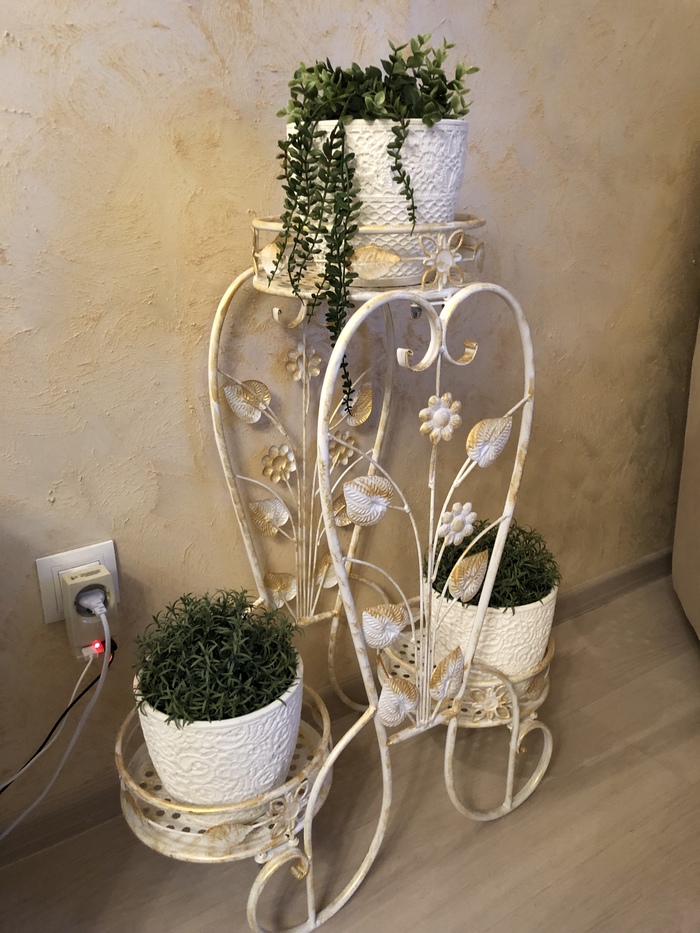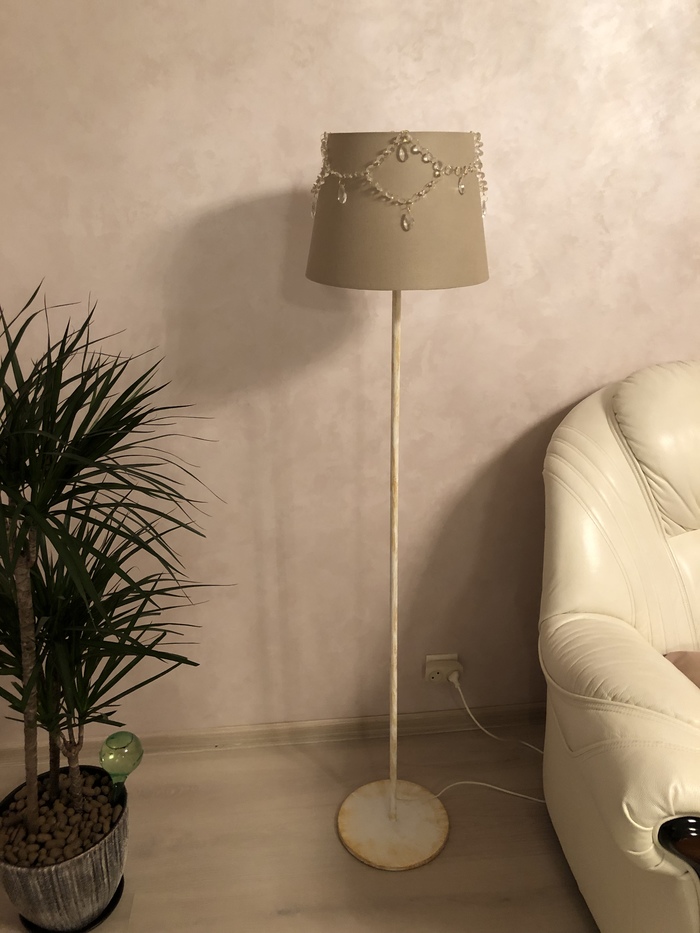 Я покрыла золотой патиной цветочные подставки и ножку торшера. На торшере дополнительно закрепляла висюльки чтоб он хоть как-то сочетался с люстрами и бра.