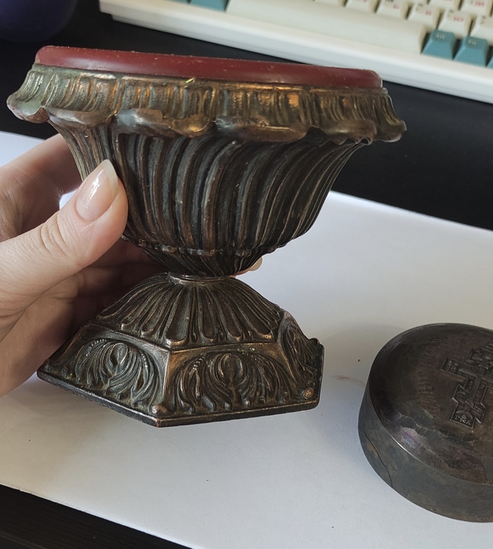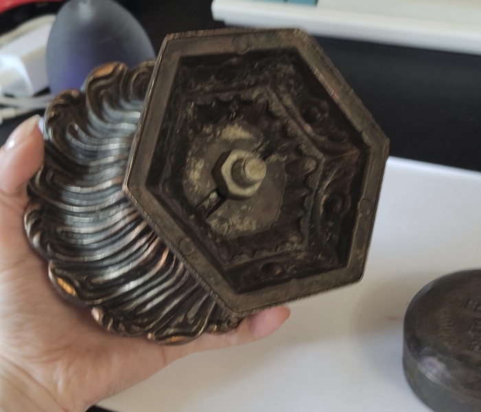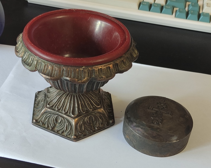 Первое - ваза/чаша из металла. Похоже больше на медь или латунь, для бронзы легковата. Вверху пластиковая чашка впаяна, держится плотно. Верх и низ скреплены болтом с гайкой.