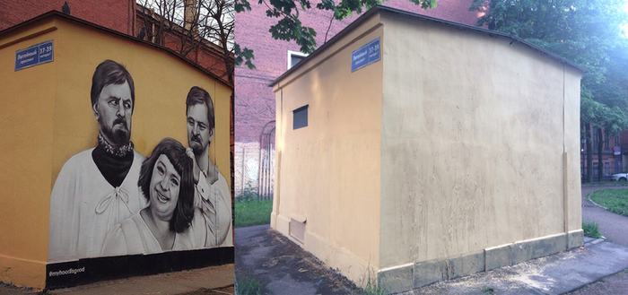 В Питере на Литейном закрасили граффити с изображением героев фильма «Иван Васильевич меняет профессию» и рисунок Морихэя Уэсибы "Не Конфуций я!"»До этого на этом же месте красовался портрет вокалиста группы «ДДТ» Юрия Шевчука https://pikabu.ru/story/na_liteynom_prospekte_zakrasili_graf...