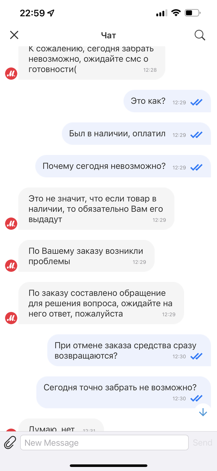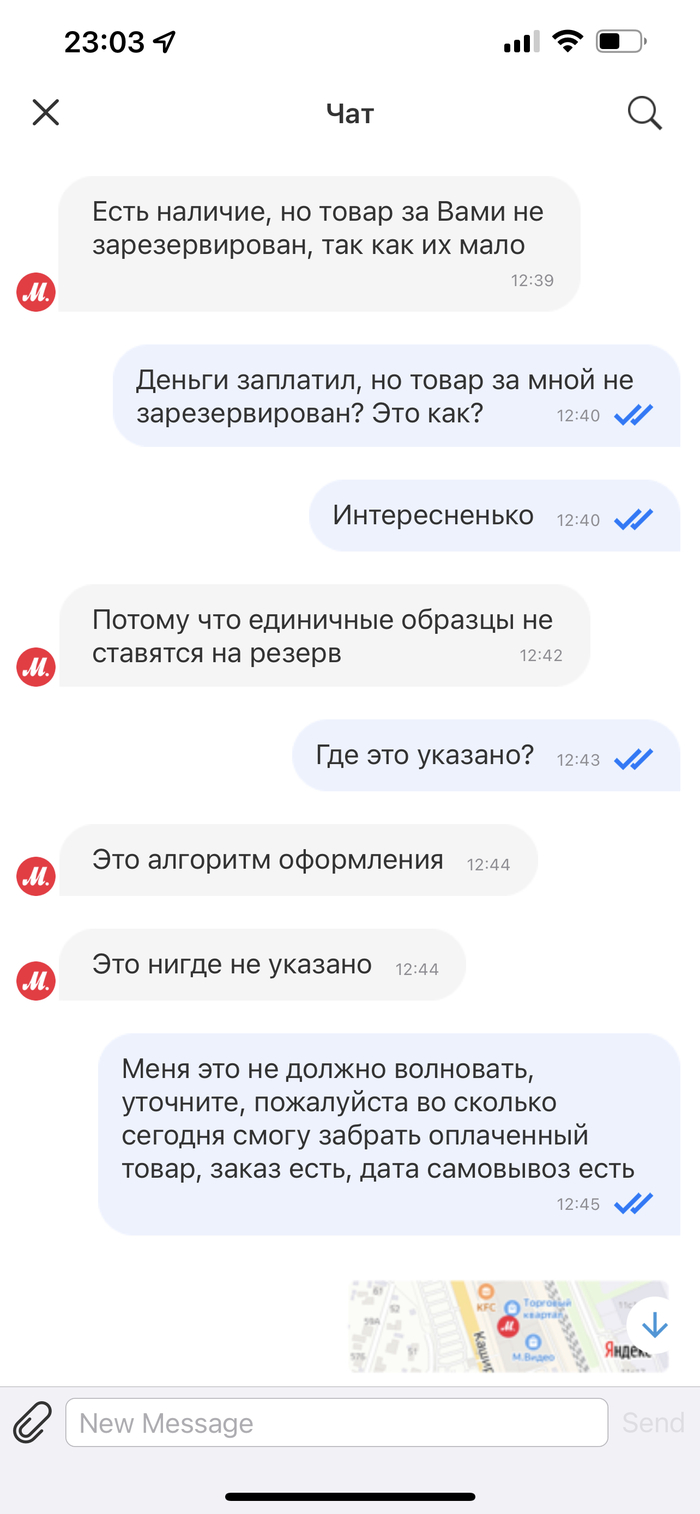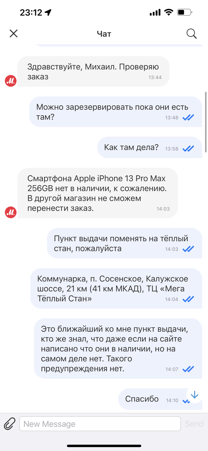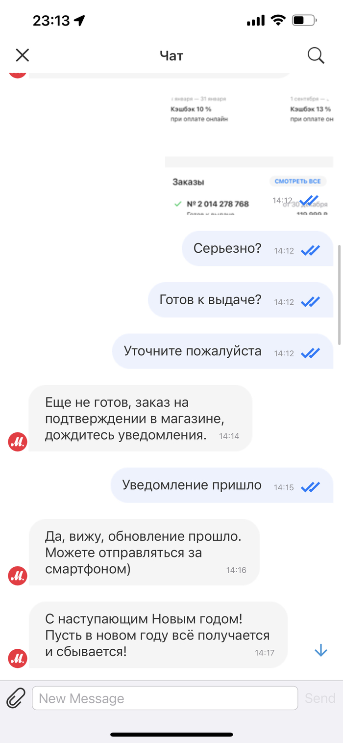 И так, предпоследний день декабря, полдень. Ввиду того, что половина моей деятельности ведется путём мессенджеров, почты и связанных с бизнесом приложений, решаю наградить себя новым смартфоном. Выбор упал на флагманскую модель эйфона. Приложение показывает, что товар в наличии и осталась одна штука!!, но в определенном магазине. Ничего страшного, я не гордый, десяток километров осилю. Обычно в мвидео заказ обрабатывают минут 10-15, но после полной предоплаты, спустя час я не получил никаких подтверждений. Написал в чат поддержки, после некоторых заклинаний меня переключают на оператора