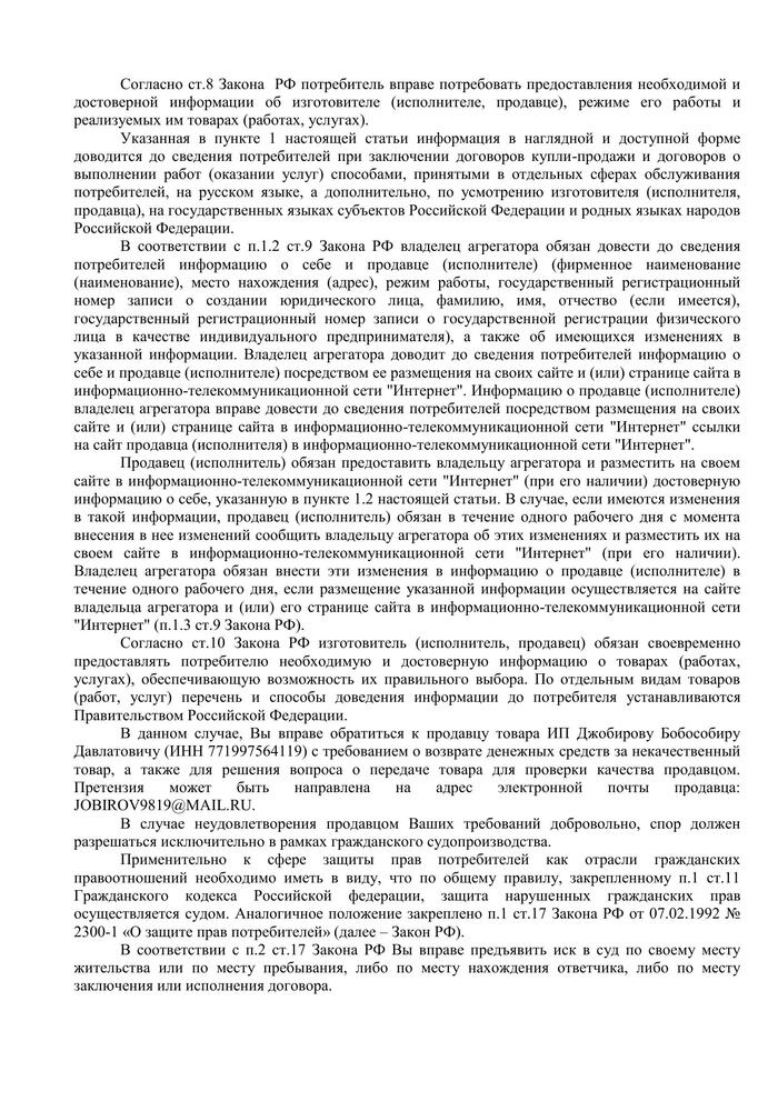 В общем, я надеялась, что продавца хоть чуть-чуть накуканят. Но получила длинную отписку. Подавать в суд за 500 рублей, конечно же, не буду. Жаль, что даже штрафа продавцу не выписали. Ничего он не нарушил. Хороший продавец. Почётный тожегражданин (или не гражданин?)