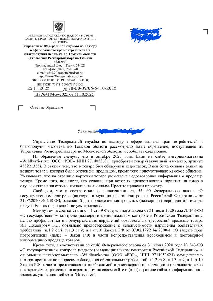 Отправляла в подольское отделение, по месту регистрации площадки Вайлберриз. Мне позвонили, уточнили адрес проживания и спустили жалобу по месту жительства.