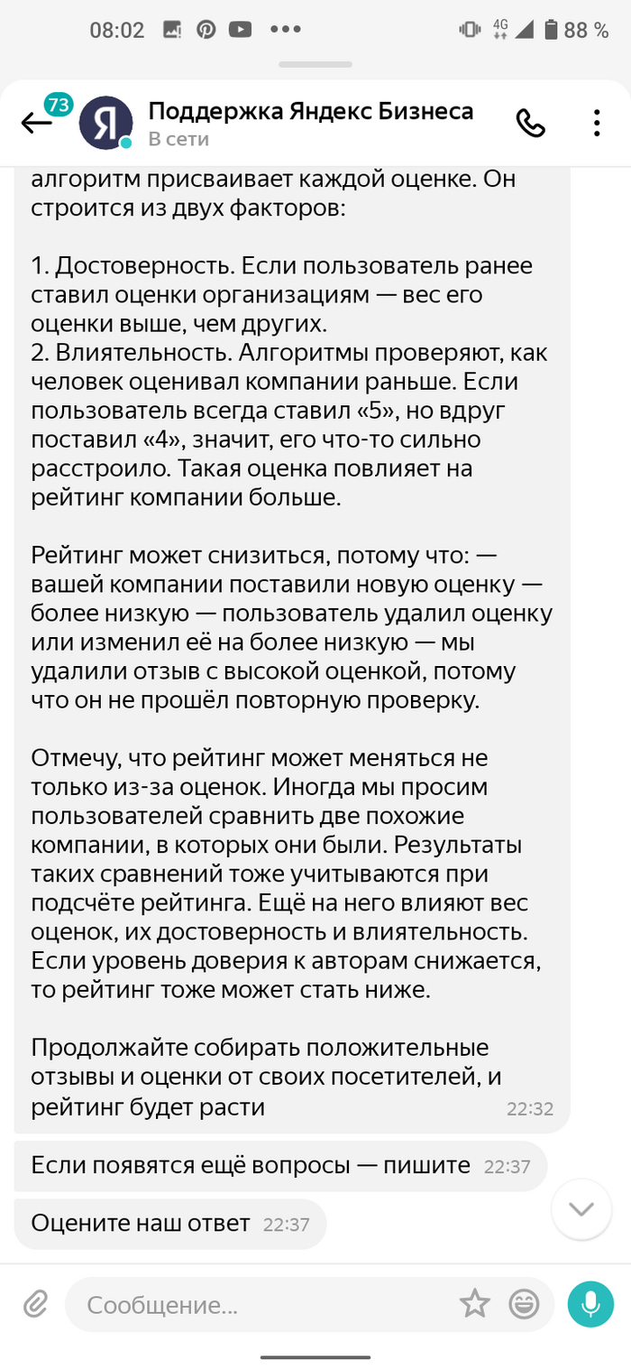 Между сообщениями поддержка отвечает мне пересказыванием правил расчета рейтинга и о том, что я все правильно понял и удаление даже негативного отзыва ваш рейтинг приспустит ещё ниже.