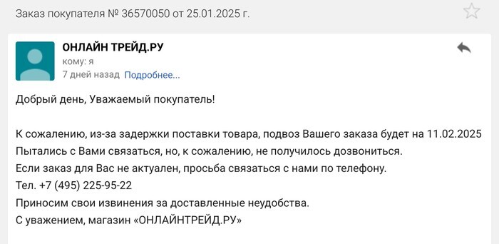 31 января в два часа дня (!) мне позвонил оператор и сообщил, что они не смогут доставить мне товар сегодня, потому что его нет даже на складе!