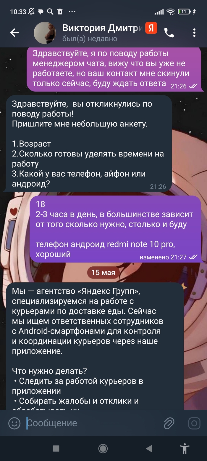 Искал вакансии, для того чтобы устроится на вторую работу. Чтобы она была простой и не время затратной (не мешала первой), по сути подработка от 4-5к в месяц. В итоге наткнулся на очередных мошенников, коих на Авито и хедхантере полно. Никто не модерирует эти объявления и как они и были, так и есть, так и будут. В этот раз попались умники которые якобы "сотрудники Яндекса". Сначала скинули мне анкету для заполнения (бог с ним там из важных данных был только СНИЛС, а без кодов они с ним по сути ничего не сделают)