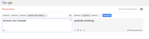 10 Kenner В пиццерии в моем городе 9 лет назад Увидел и решил загуглить точный перевод. Был немного удивлен) В коментах подсказали что точное значение "мудак, не кури!" Показать полностью 2 [моё] Юмор Тернополь Курение Итальянский язык