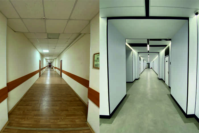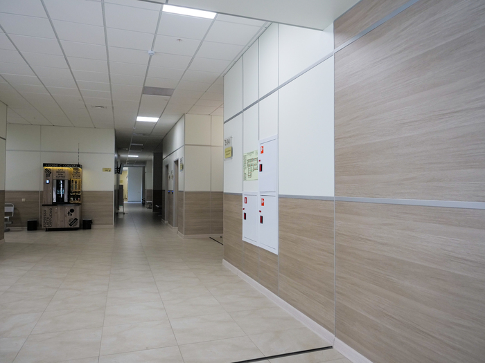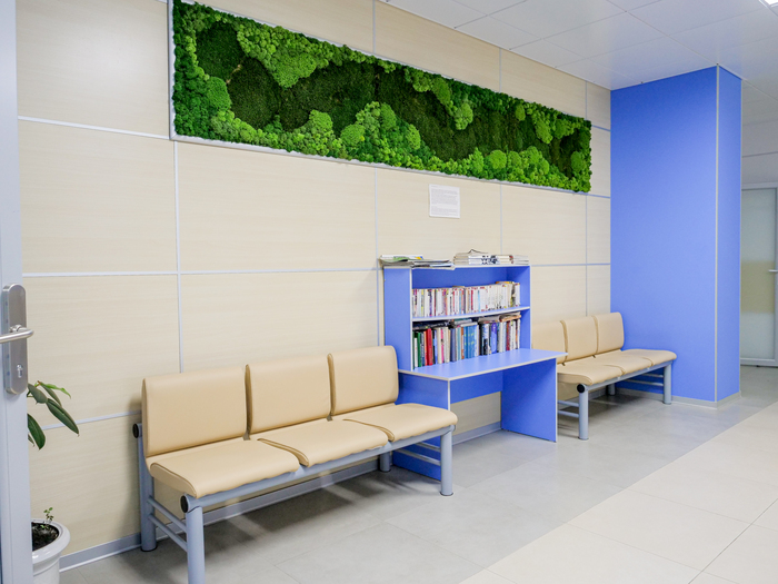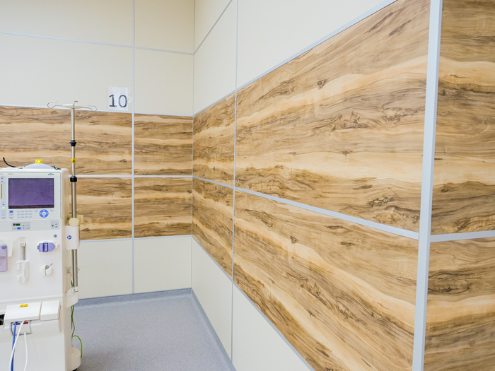 Ещё одно из преимуществ стеновых панелей в том, что покрытие не впитывает грязь как например покрашенные стены, и устойчиво к влажной уборке и обработке дизенфицирующими средствами. Поэтому среди наших объектов много различных медицинских учреждений.