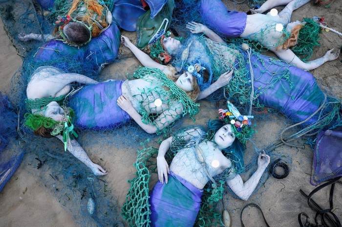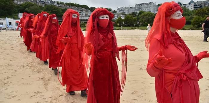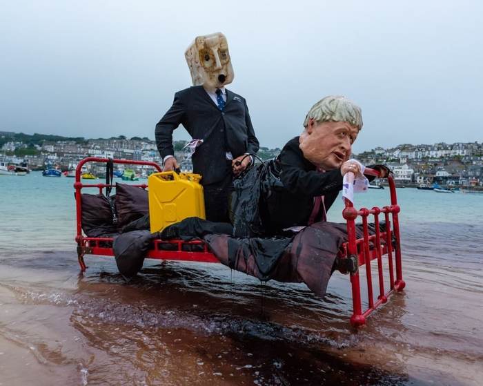 Вчера они устроили перфоманс с мертвыми русалками, а 9 июня разыграли театральную сценку "Борис Джонсон в кровати с нефтяным олигархом" прямо напротив отеля делегаций.