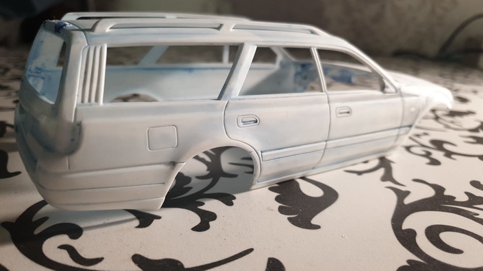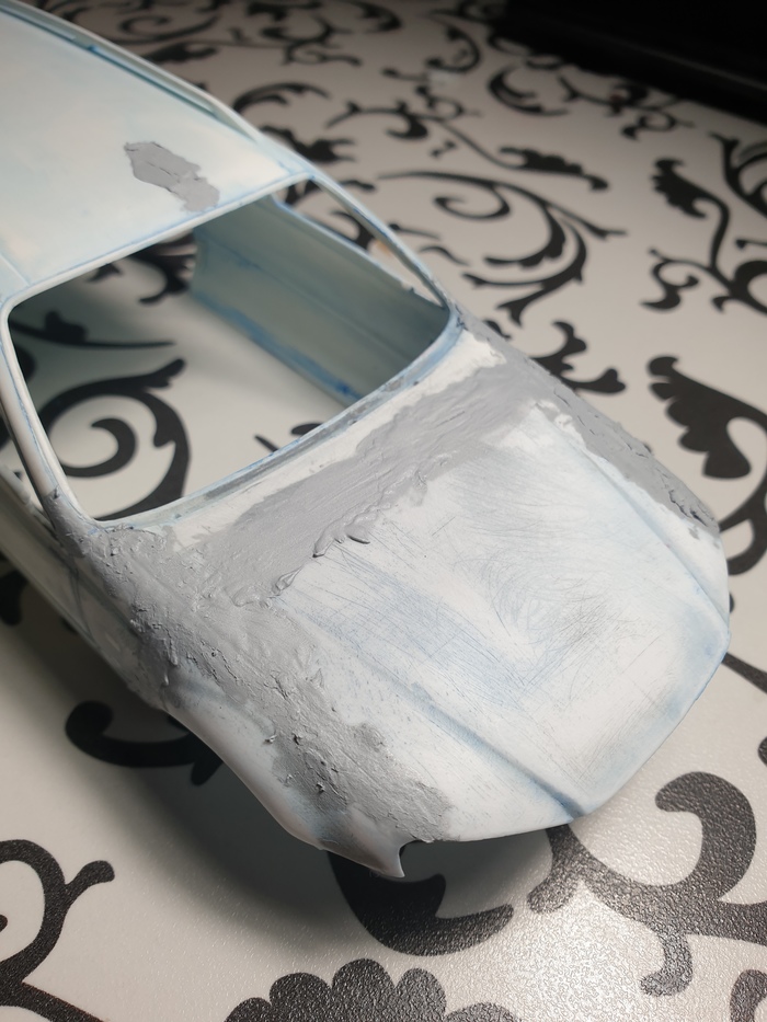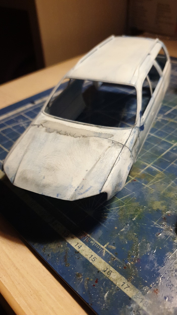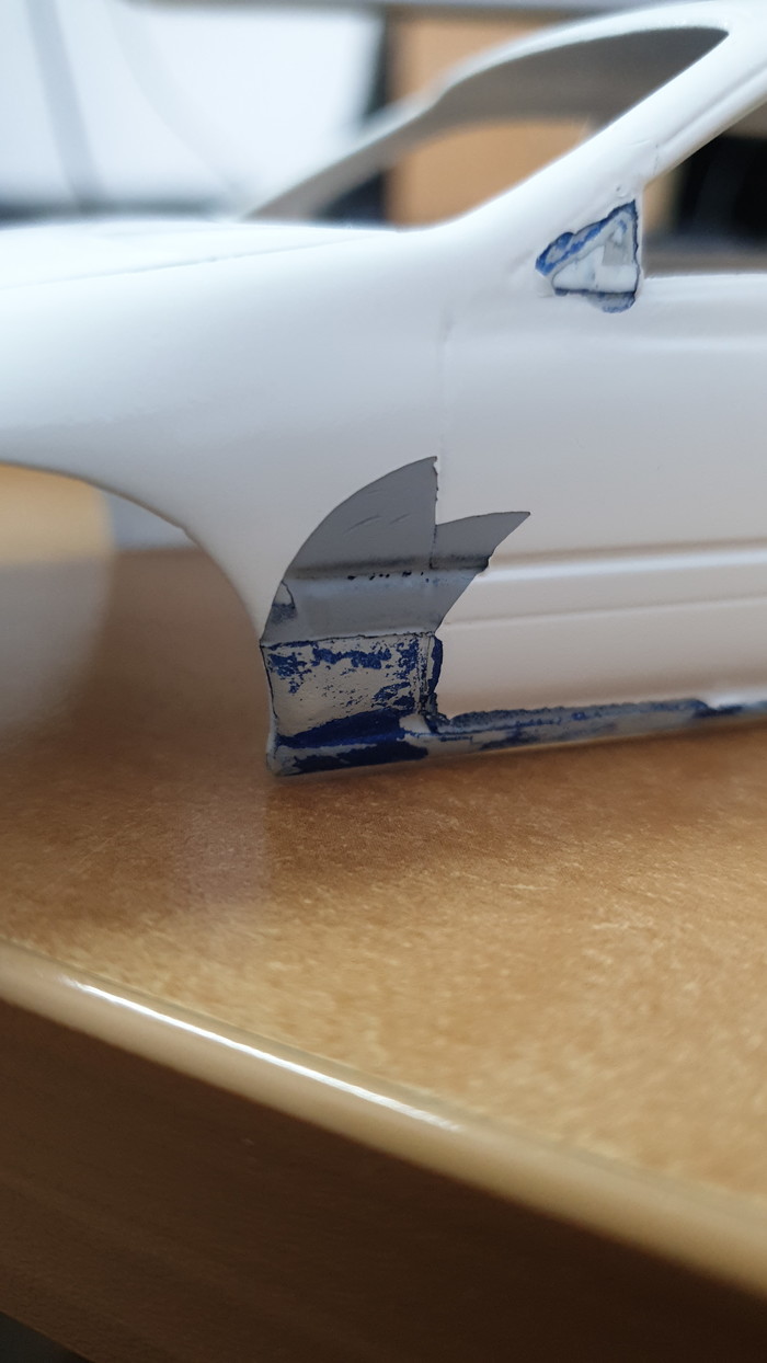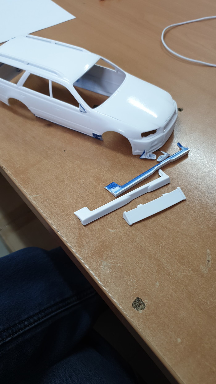 На текущем этапе я снял все 3 слоя лкп с модели (внимание, в порядке убывания! белая краска-грунт-синяя краска-пластик :)) ), оторвал пороги, бампер, зеркала и спойлер, отмыл их тоже, шлифанул 600 кузов, проклеил пластик, который от такой отмывки стал довольно хрупким, и слегка пошпатлевал косяки на капоте и правом боку. Продолжение следует