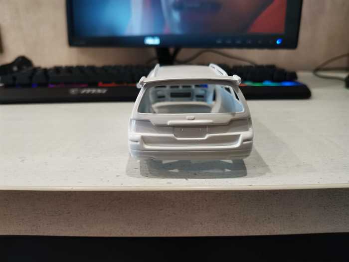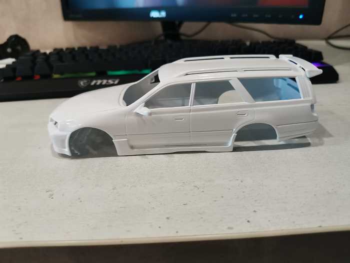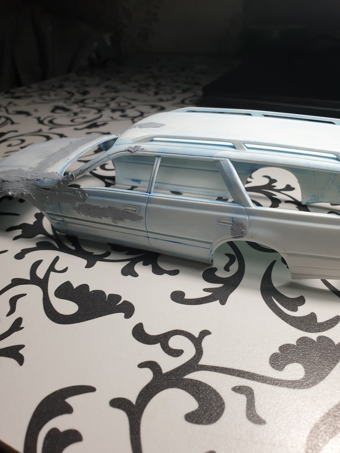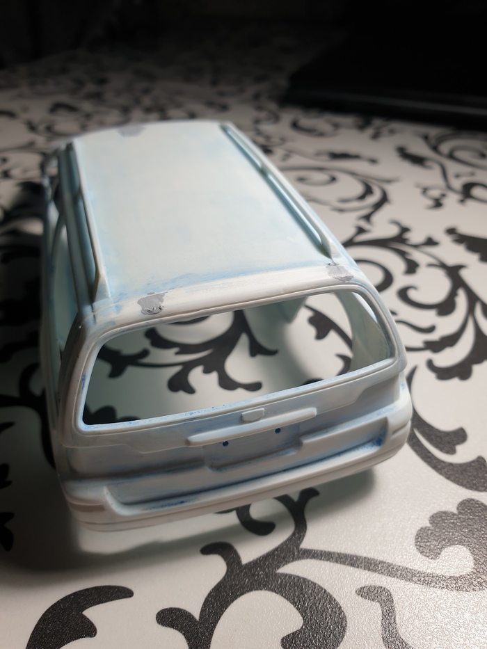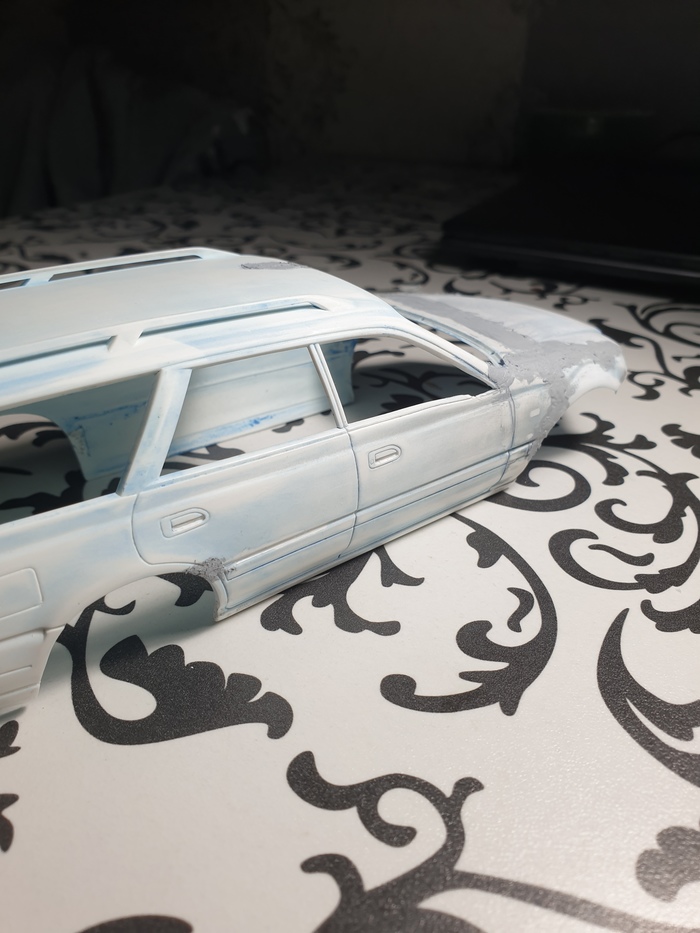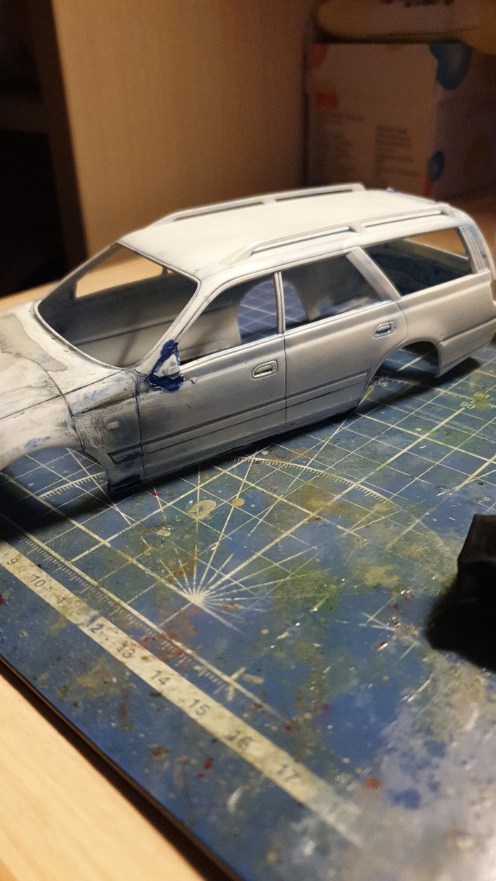 На текущем этапе я снял все 3 слоя лкп с модели (внимание, в порядке убывания! белая краска-грунт-синяя краска-пластик :)) ), оторвал пороги, бампер, зеркала и спойлер, отмыл их тоже, шлифанул 600 кузов, проклеил пластик, который от такой отмывки стал довольно хрупким, и слегка пошпатлевал косяки на капоте и правом боку. Продолжение следует