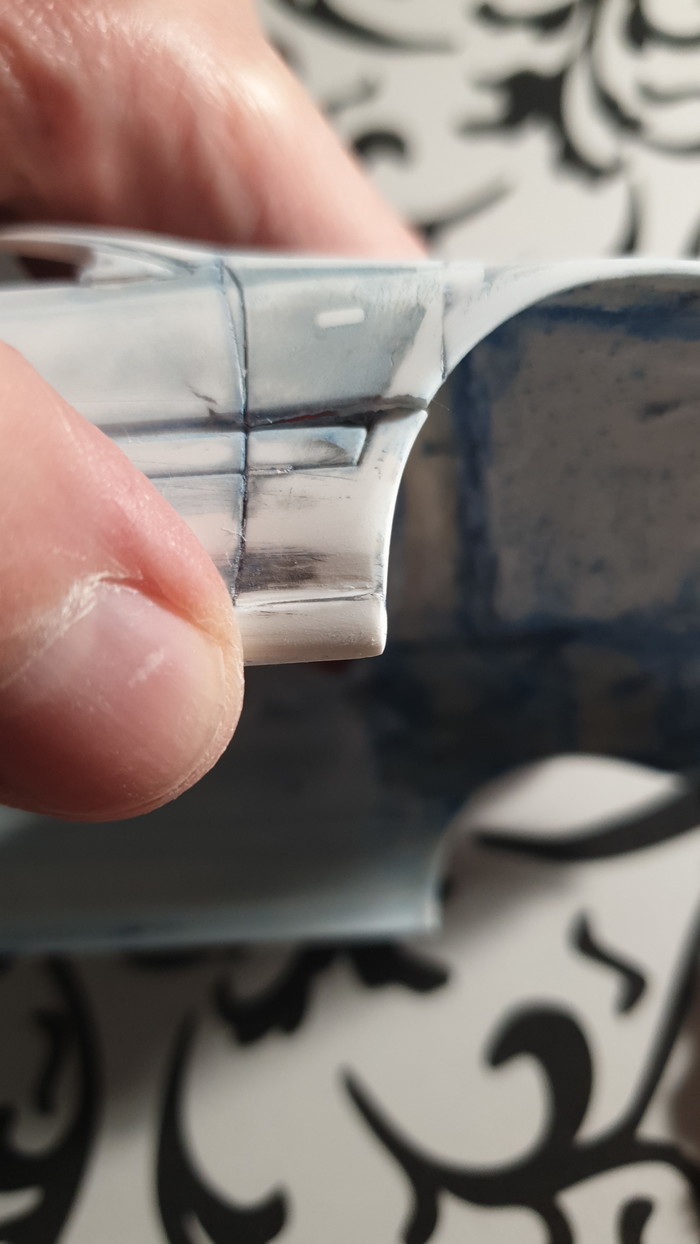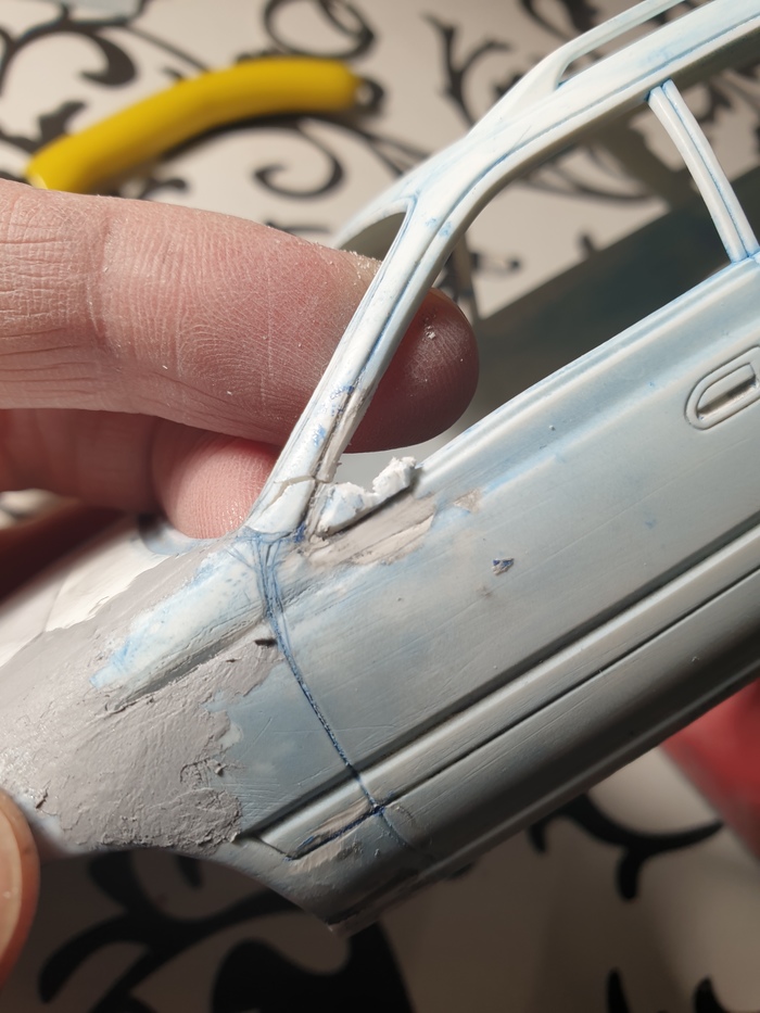 Как видите отмыл модель до пластика, отчего он стал довольно хрупким, шлифанул 600 шкуркой, и шпатля шпатля шпатля. Также вырезал стаговские площадки для зеркал, потому что надо воткнуть гэтэровские зеркала, а у них другая посадка. В процессе стойке поплохело
