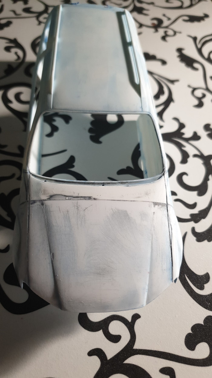 Дальше в планах расшивка - углубление либо нарезание новой по шпатле (капот, стойки лобового), выпиливание люков на крыше 2 шт., втыкание зеркал, ну и песня с передним бампером, которому сейчас откровенно плохо - там отмывать и подгонять, и подгонять, и подгонять. Модельное божество, дай мне сил...