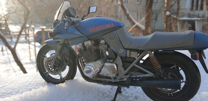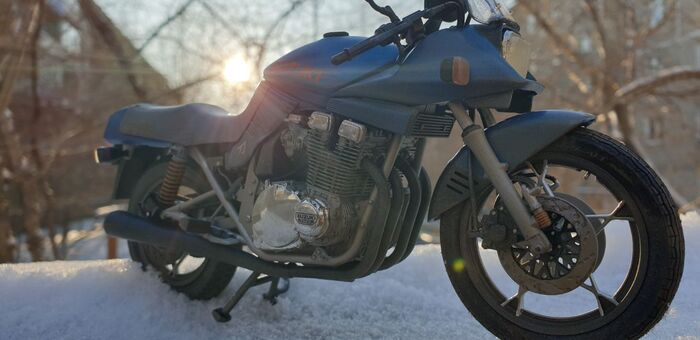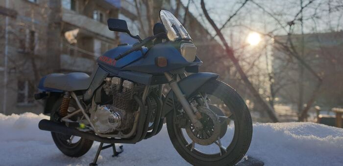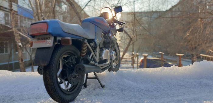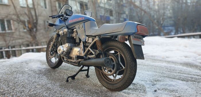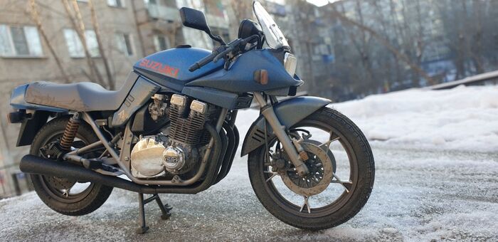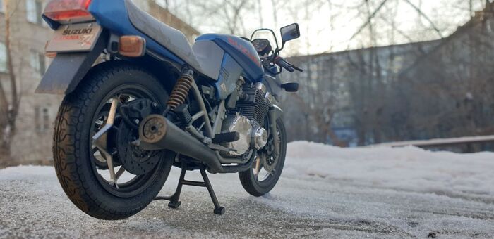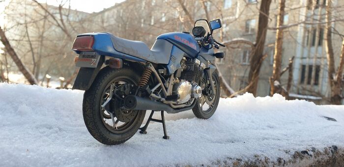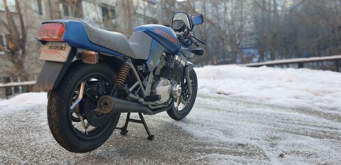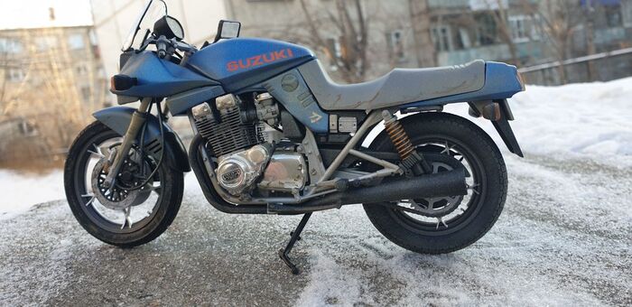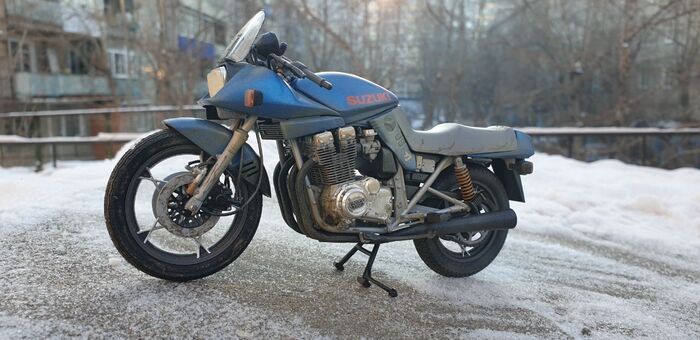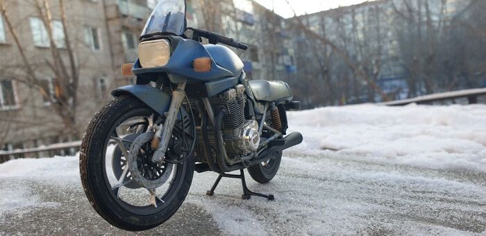 Всем привет. Писать особо нечего - стандартная стройка, без кастомизации и афтемаркета. Пришлось перекрасить. Изначально было сине- серебристым. Но в кои то веки мне лак поднял декали на боковых обтекателях. Досадно конечно. Ну выбрал черно-синюю схему окраски. Цвет конечно хрен поймаешь