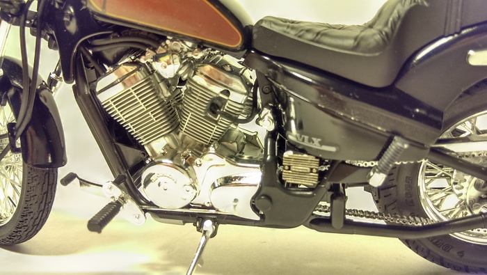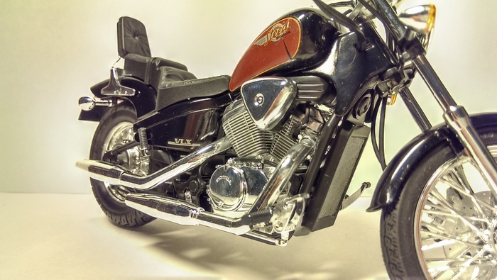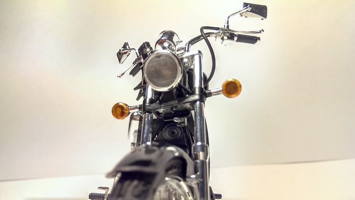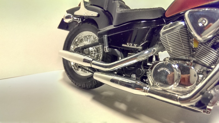 Модель собиралась в течении года. Два раза перекрашивалась. Спросите почему? Потому что я не умею работать с декалями в виде тонких полосок. Сначала я убил черные полосы под светлую окраску, а после и серебристые под темную. Потому ЛКП вновь было смыто, и было принято решение нанести декали с одного из ревелловского мускулкара. В то же время хотелось соблюсти некий цейтнот и не превратить этот отлчиный круизер в разукрашенную елку. Переборщил или нет - решать вам :)