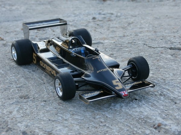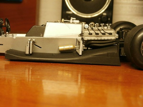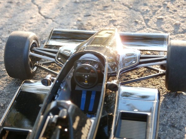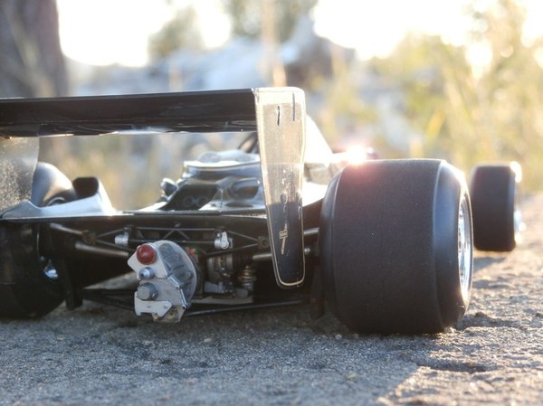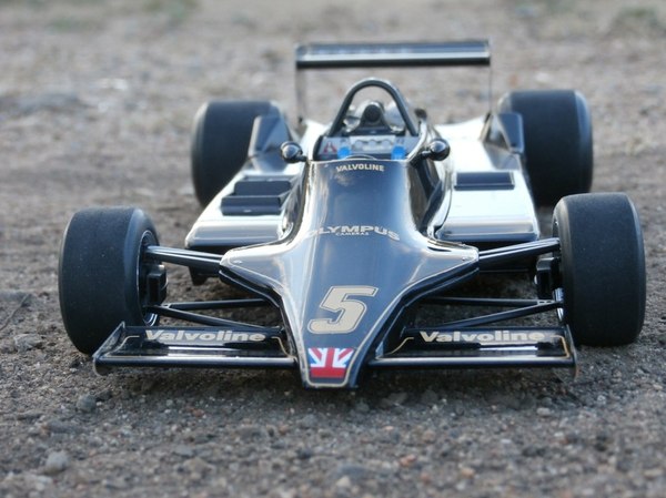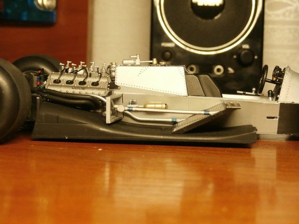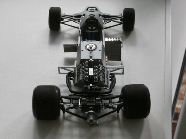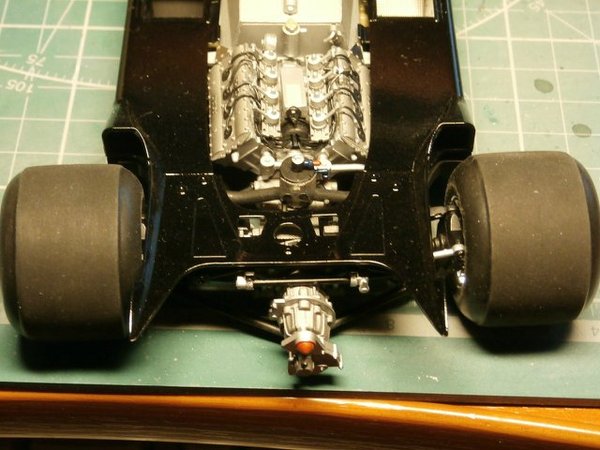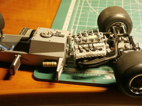 Модель строилась на протяжении примерно 3-х месяцев. В принципе она была бы закончена месяца за 2, но на финальной сборке кузова и установке его к ходовой выяснилось, что машина "села на брюхо". Могу предположить, что у предыдущего владельца коробка долгое время простояла на боку, и пластмасса на литниках слегка провисла, а потому кузов (выполнен одной большой и довольно тонкой деталью) скрутило восьмеркой. Переднее левое колесо стояло на внутренней стороне, висела внешняя часть слика, заднее правое - наоборот, стояло на внешней части. Пришлось модель почти полностью разобрать, усилить ходовую часть, также в процессе был перекрашен кокпит, добавлена смывка и сухая кисть. После сборки все встало как надо, но меня дико раздражали щели между обтекателями, которые по идее производитель дал съемными для демонстрации мотора и, как раз кокпита. Скрепя сердце, я решил сделать модель в боевом варианте, без возможности съема панелей кузова, дабы избежать этих несуразных щелей. Естественно от двигателя теперь видно только защитные сеточки, хотя сам силовой агрегат Ford Cosworth DFv 3.0 исполнен довольно точно. Да и сухая кисть со смывкой теперь тоже скрыты от глаз.