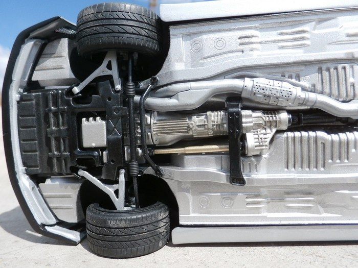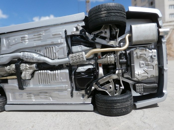 Ну а теперь нытьё. Моделью недоволен! Строилась без малого два года, попутно собралось еще 3-5 моделей куда лучшего качества, чем этО. Все шло наперекосяк с самого начала. Как только я отрезал первую деталь от литника, помню как вчера - левый амортизатор, так я тут же его уронил на пол, прямо под нос своему собакену. Собакен чисто инстинктивно подумал, что это порция хавки со стола перепала, и быстренько ее зажевала. С трудом выколупал эту злосчастную деталь, но помогло это мало, пришлось искать донора на профильных форумах. Собаке хоть бы хны. Еще один роковой шаг - это решение выпилить с днища раздатку, бензобак и имитацию двигателя, чтоб легче было окрашивать все это добро.