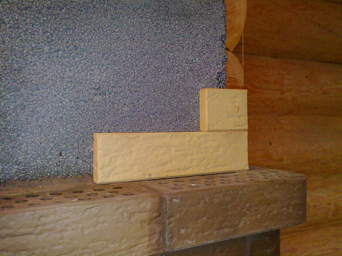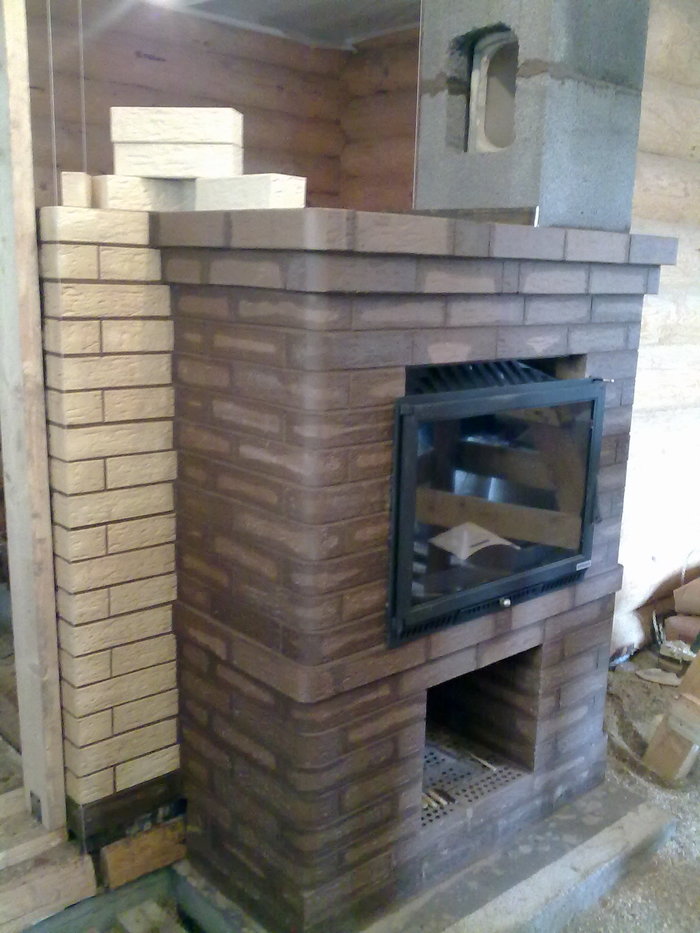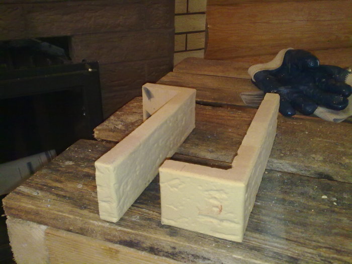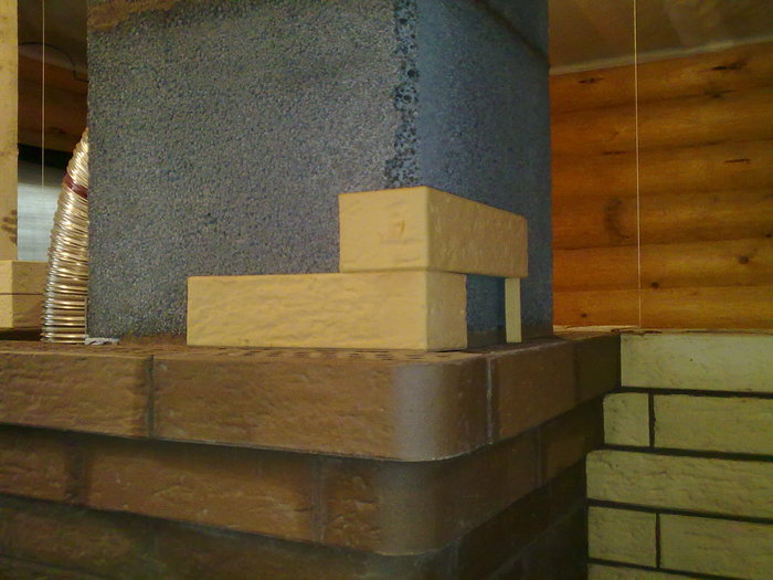 все весовые и тепловые нюансы были учтены, оставался только один вопрос - как быть с визуализацией, ибо при таком распределении "трубы" (2-х компанентной гильзы) не остается места для отделочного кирпича... я предложил отцу идею, а потом долго и красиво "трахился" над одобренной темой: пилить кирпич в "Г-образной форме", чтобы создать на "лице" красивость и правильность структур...