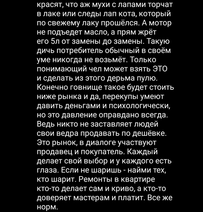 Искал машину себе пол года назад, бюджет до 5к$. Главное условие тогда было - это автоматическая коробка полноценная. Были сотни вариантов авео, лачетти, лансеров. Но как-то попалась мазда 6, чёрная, 2 литра, по фоткам хорошая, и цена 4700. Беда только, что машина в другом городе, ехать ~400 км в одну сторону. 2 дня с продавцом созванивался, договаривался, расспрашивал про косяки и намечал дату встречи. Выбрали на субботу, разговор был в пятницу. Мол, всё, ждёт вас тогда, езжайте. Сукападлагнида, восьмиблядская ярость!!!! Я как еблан поднял жопу в 4 утра, преждевремменно договорившись и с батей, чтобы часиков в 8-9 быть в другом городе.