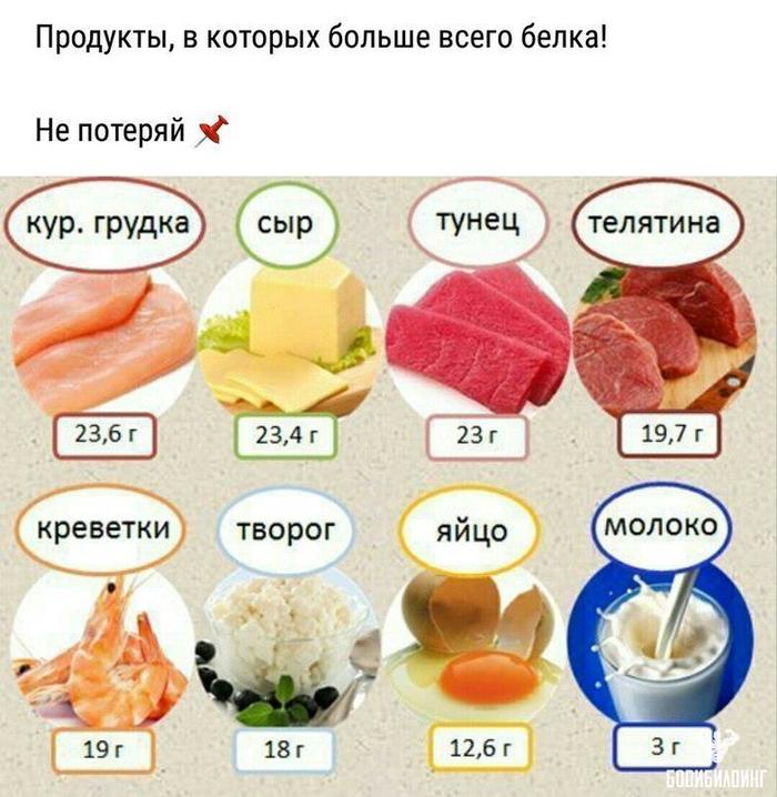 Источники белков: филе куриной грудки или индюки, говядина, молочные продукты: молоко, кефир, творог, твердый сыр, яйца, питательные белковые средства (протеин), рыба.