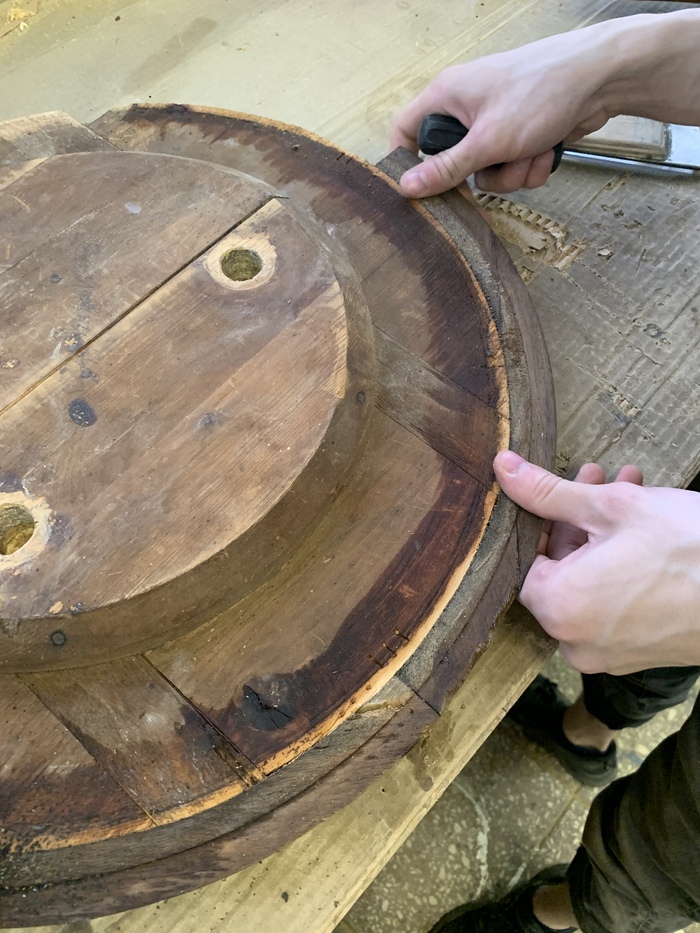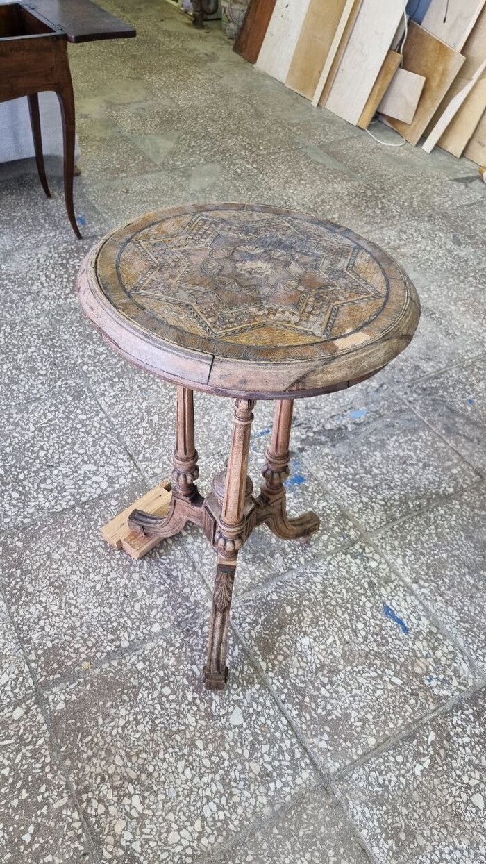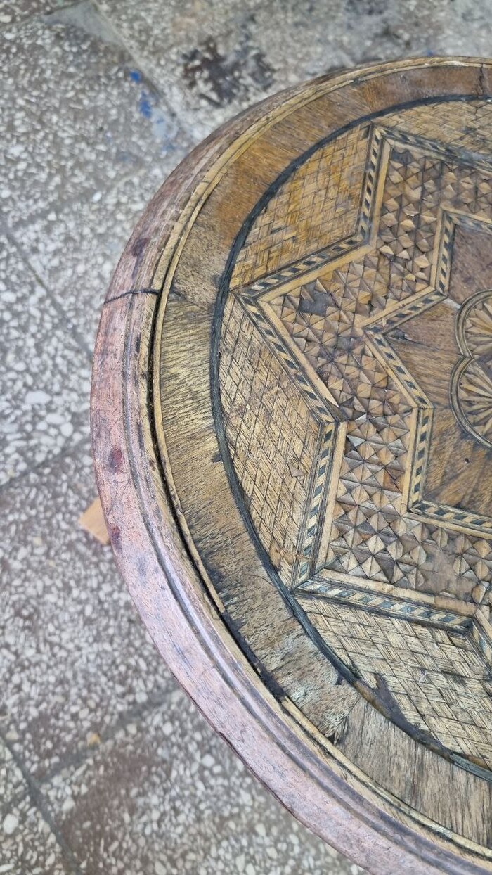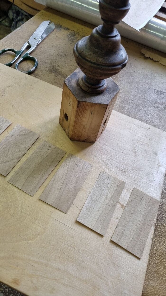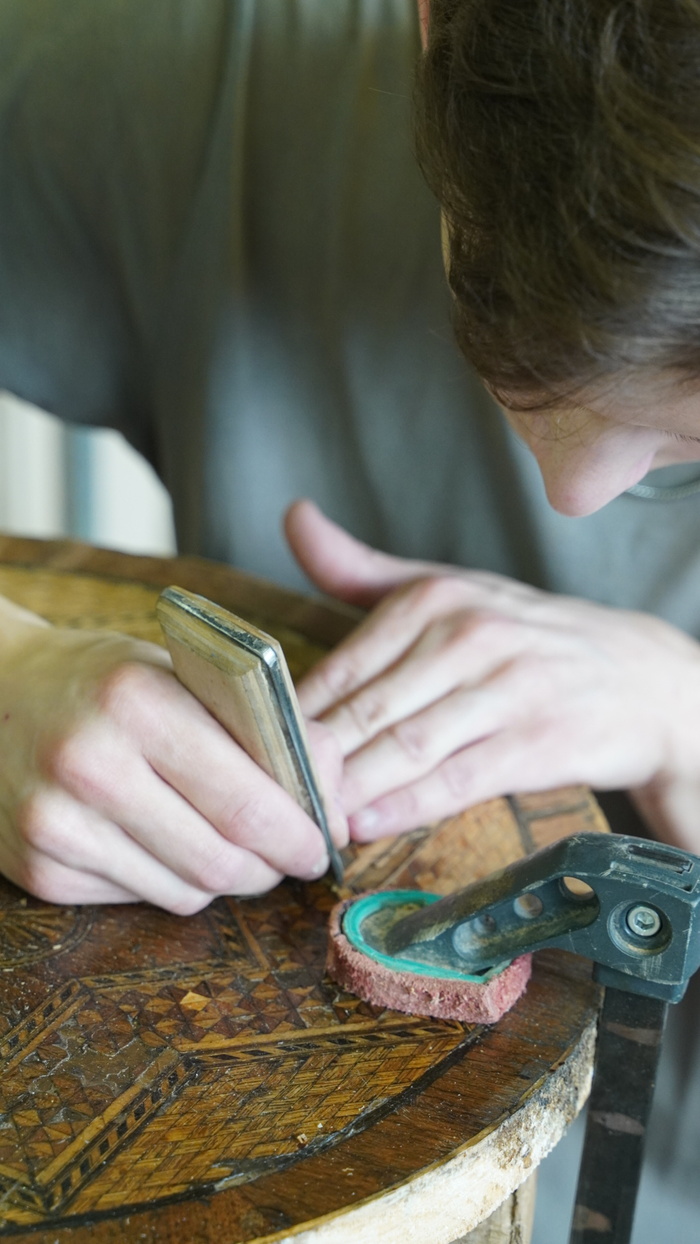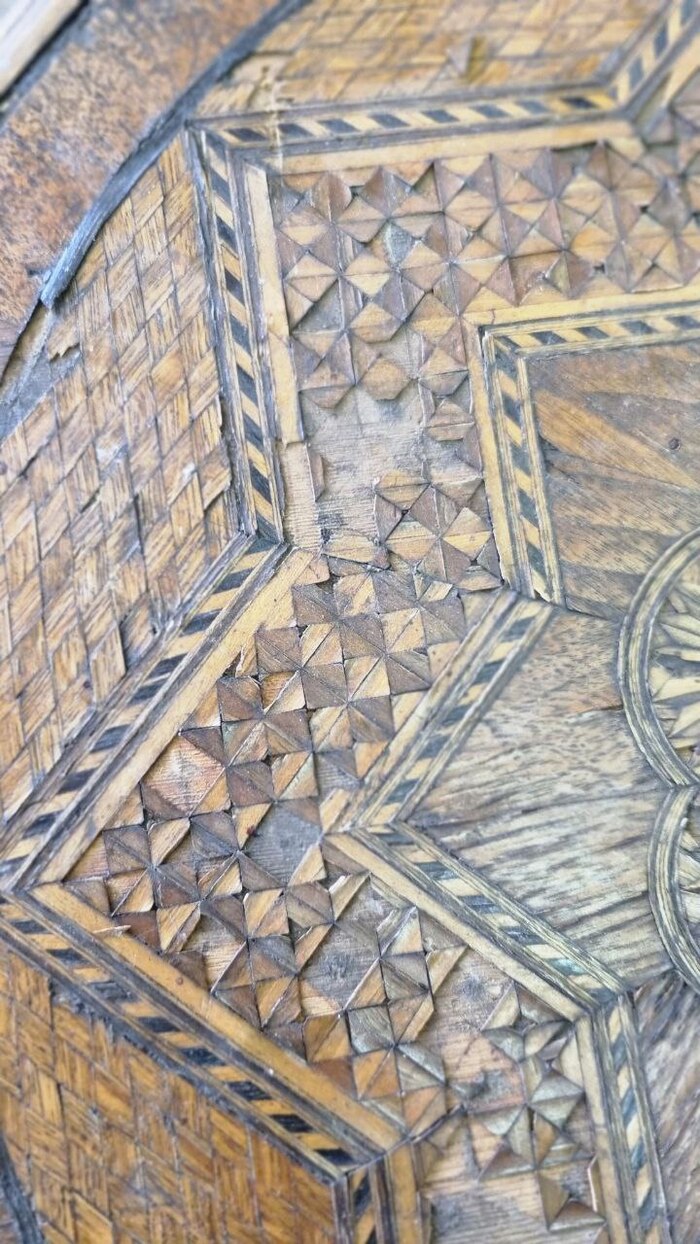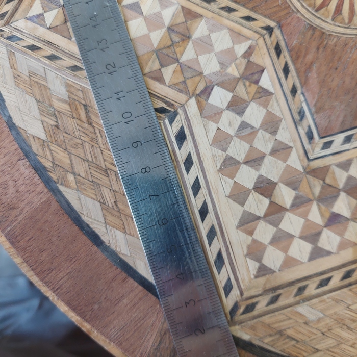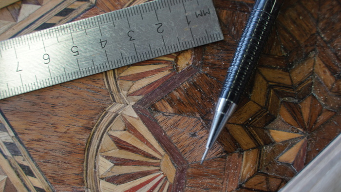 Приступили к сложной работе. Нужно восстановить маркетри на столешнице кофейного столика.